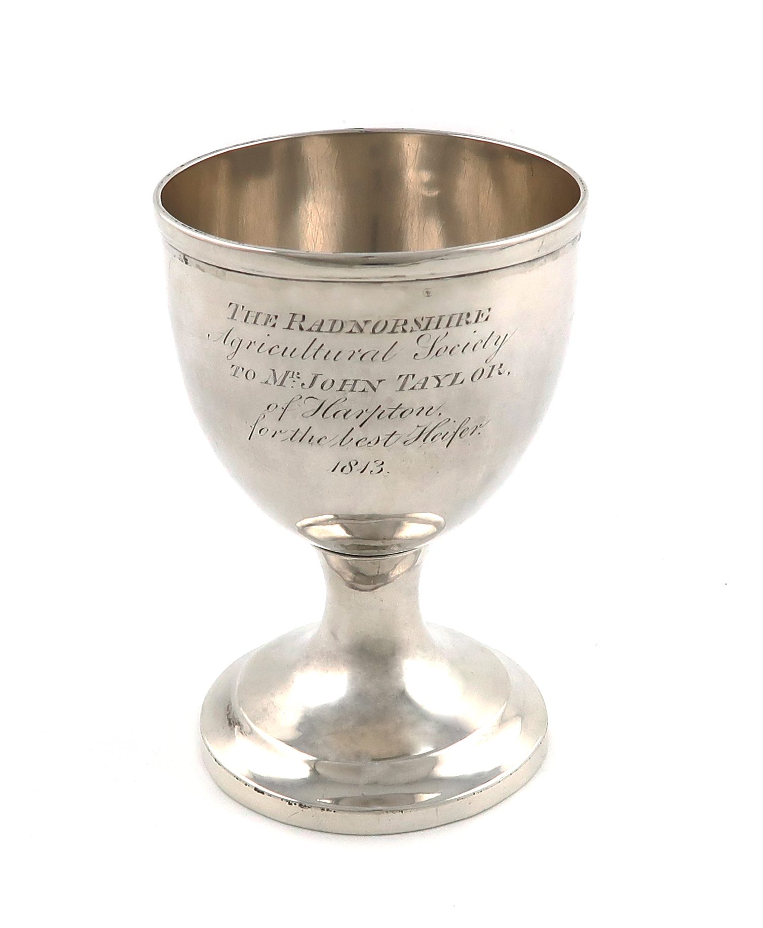 plain urn bowl, engraved with a cow above 'Pleasant', and inscribed 'The Radnorshire Agricultural Society to Mr. John Taylor of Harpton for the best Heifer 1813', on a raised circular foot, height 10.5cm, approx. weight 4.2oz.