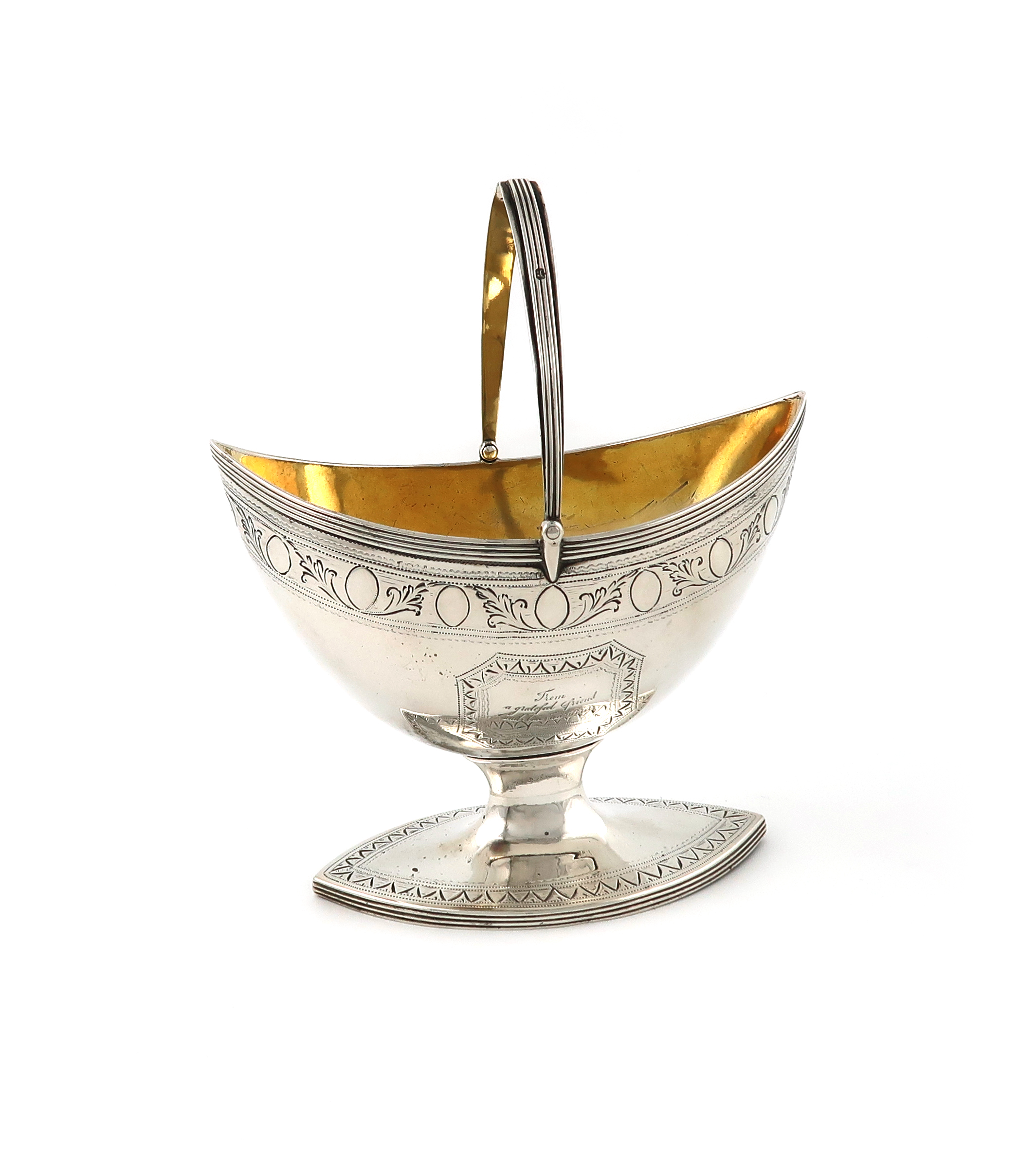 oval navette form, gilded bowl, bright-cut decoration, with a presentation inscription to Mr Charles Judge, Hull, length 14.2cm, approx. weight 7.6oz.