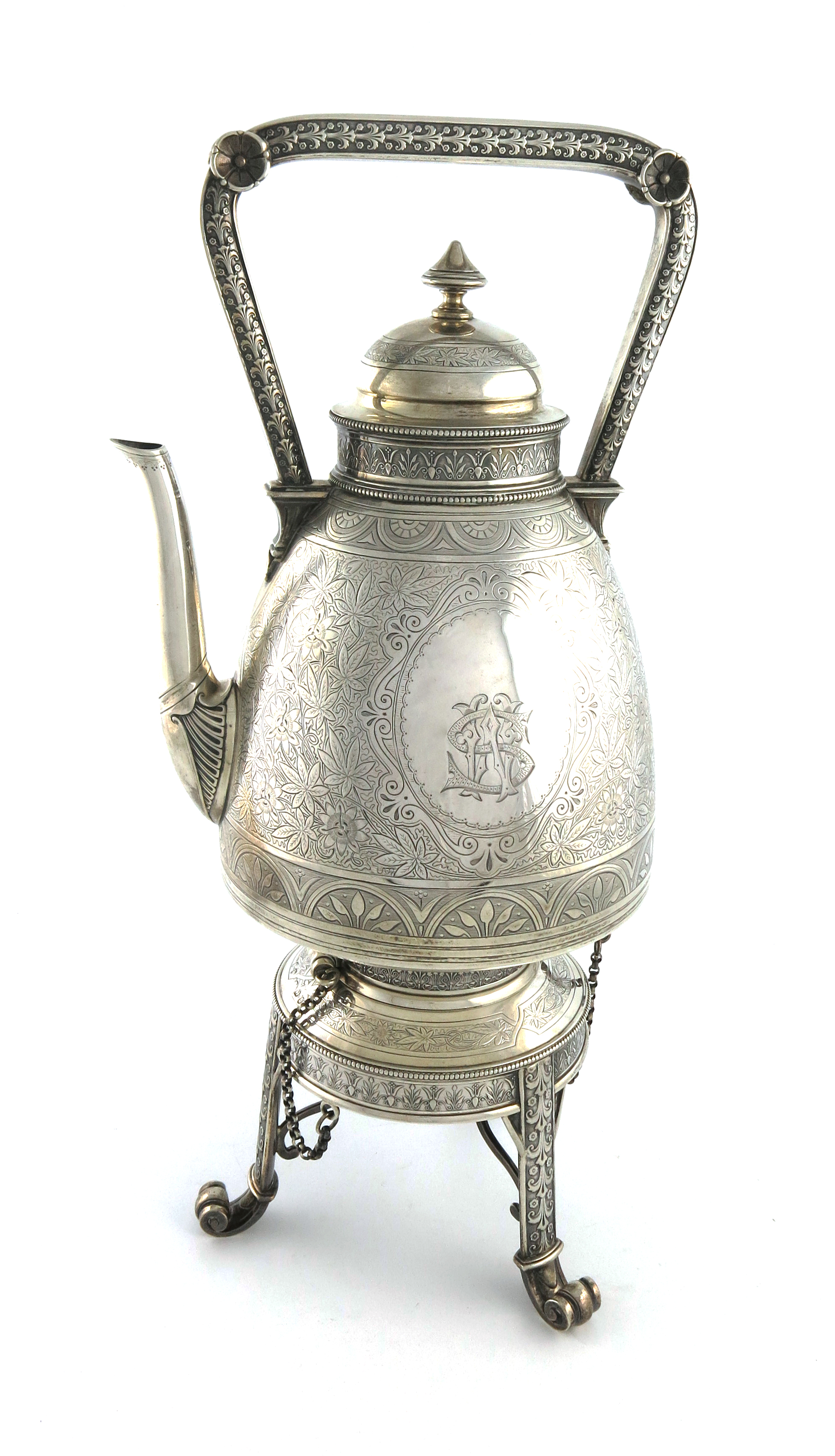 tapering circular form, engraved foliate decoration, the carrying handle with foliate motifs, initialled, the stand of circular form, on three scroll legs, lacking burner, height 45.3cm, approx. weight 76oz.