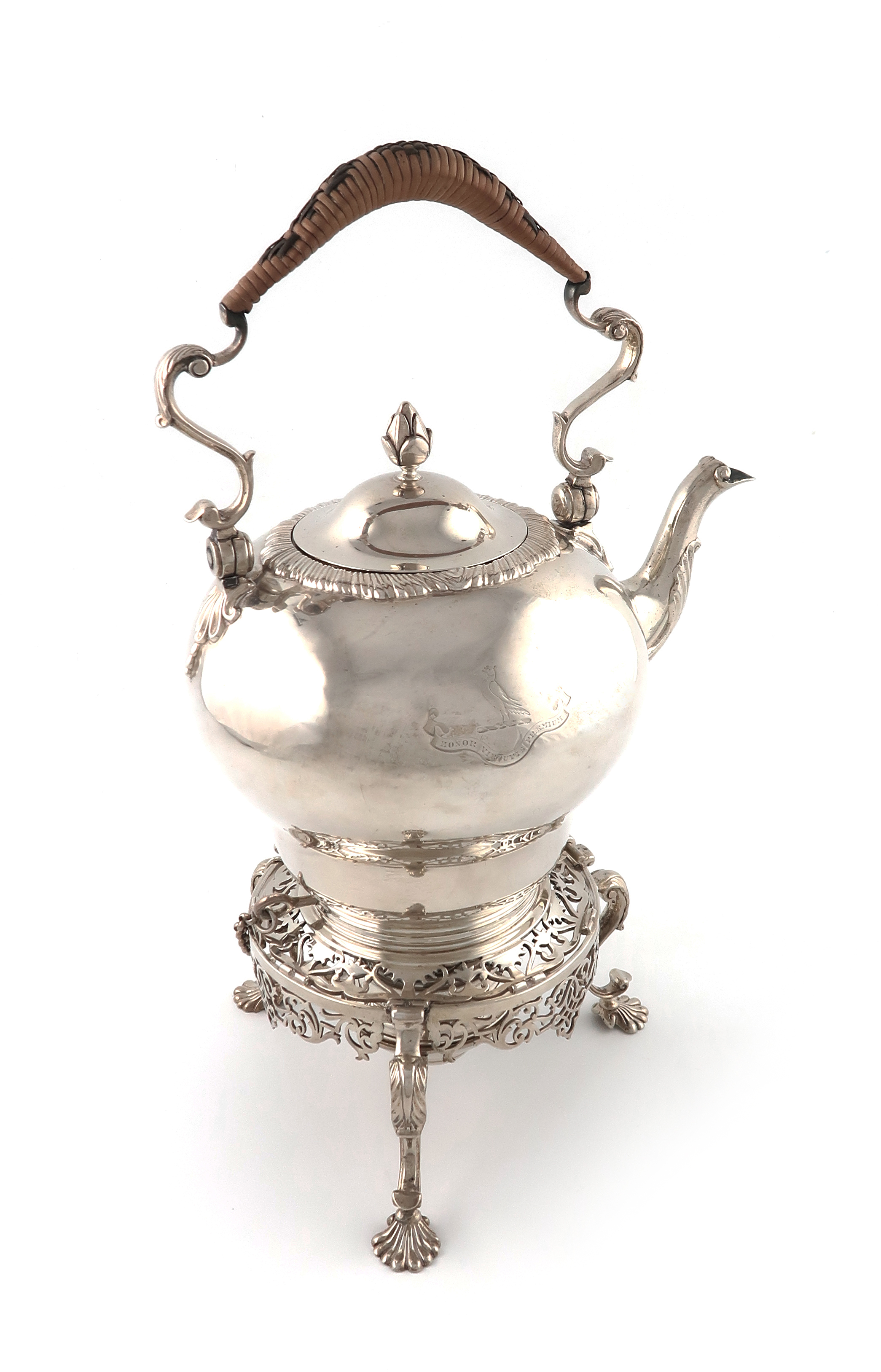 baluster form, wicker-bound swing-handle, gadroon border, leaf capped spout, hinged wicker-bound handle, the stand of pierced circular form, on three scroll legs on pad feet, with a burner, height 38cm, approx. weight 60oz. (2)