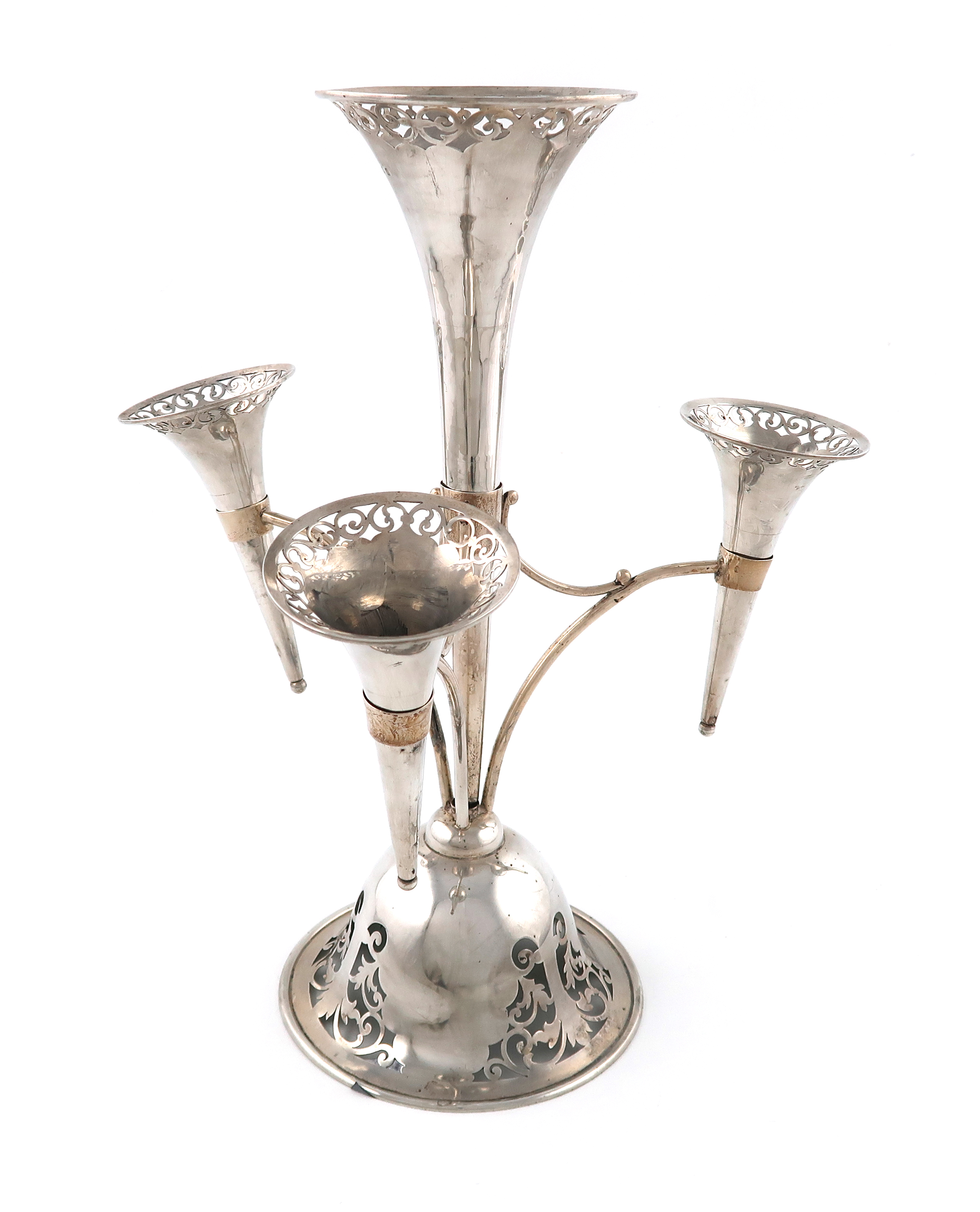 central tapering pierced vase, with three scroll arms each supporting a pierced vase, on a raised pierced circular foot, some pitch to underside of base, height 30.4cm.