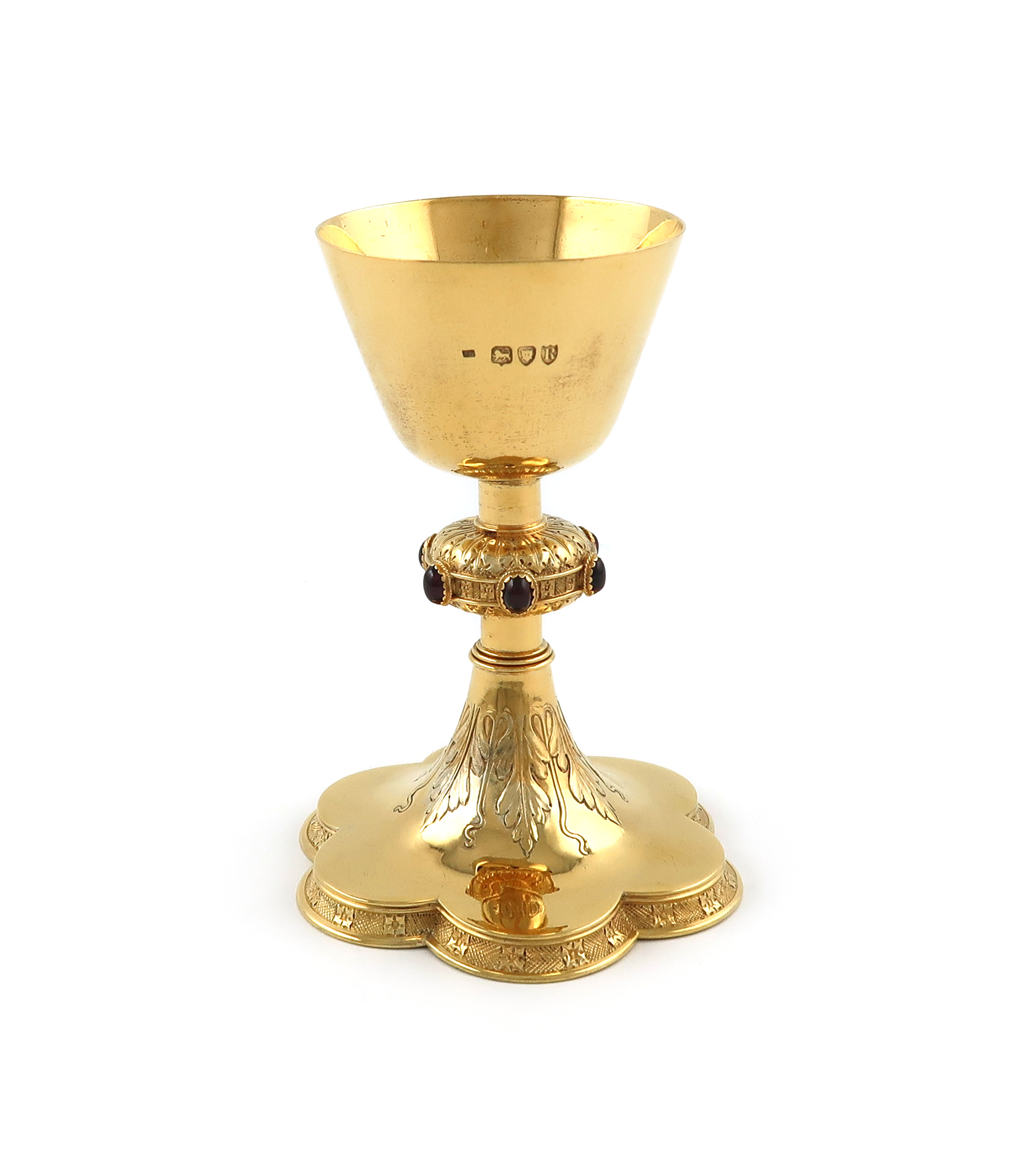 plain tapering form, the knopped stem with chased foliate decoration and a hardstone cabochon border, on a raised hexafoil base with chased foliate decoration and a diaper border, height 12.6cm, approx. weight 4.8oz.