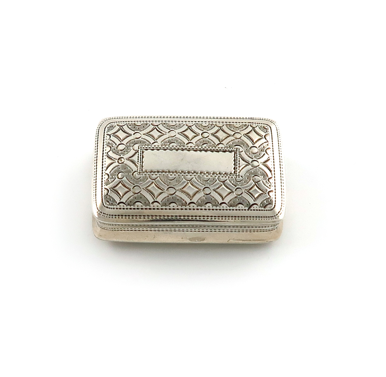 rectangular form, bright-cut decoration, the hinged cover with a blank cartouche, gilt interior, hinged pierced grille with musical instruments among foliate scrolls, length 4cm, approx. weight 0.7oz.