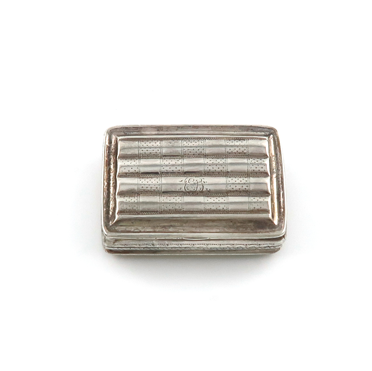 rectangular form, bright-cut fluted decoration, the hinged cover initialled, gilt interior, hinged pierced foliate grille, length 4cm, approx. weight 0.8oz.