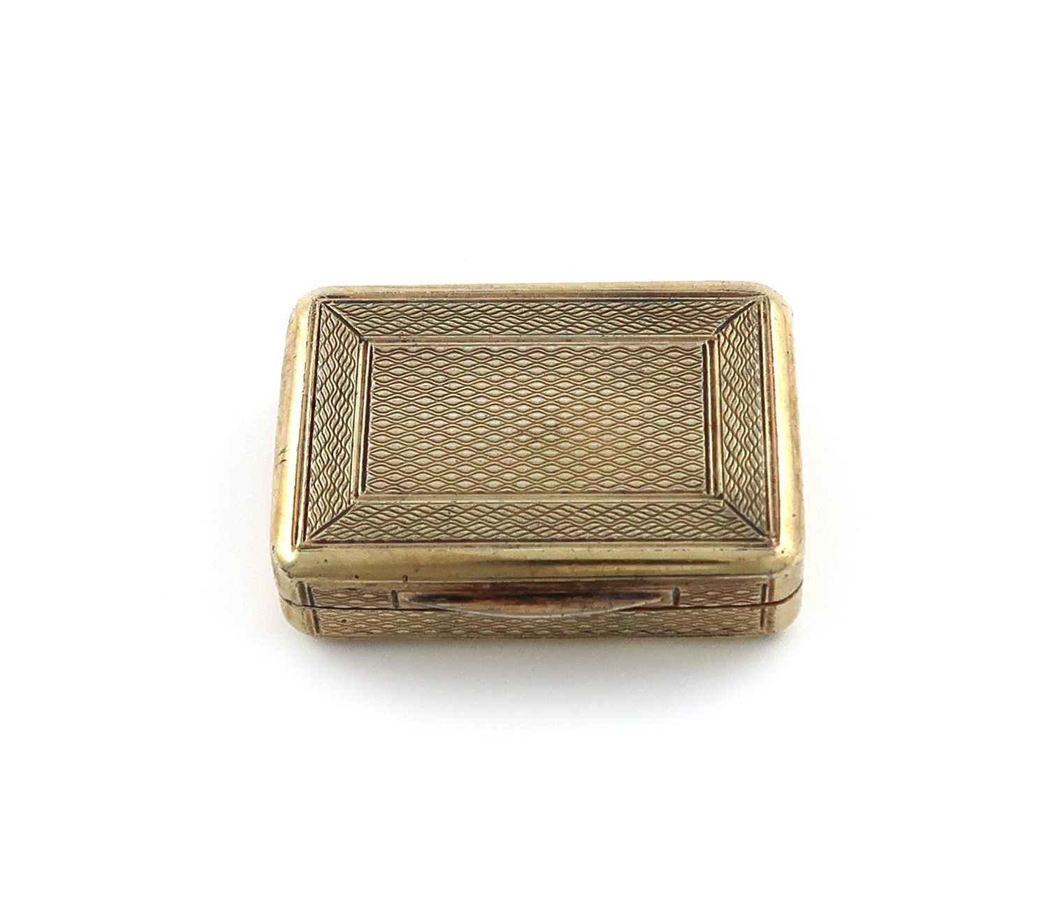 rectangular form, engine-turned decoration, the hinged cover with a plain thumbpiece, gilt interior, hinged foliate scroll grille, length 3.5cm, approx. weight 0.7oz.