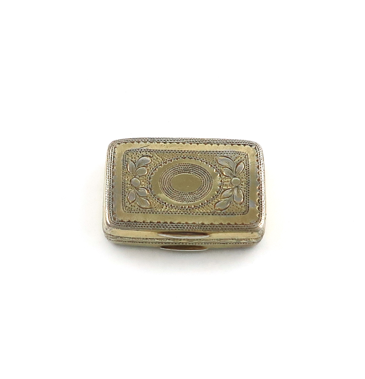 rectangular form, bright-cut decoration, hinged cover, gilt interior, hinged pierced foliate grille, length 3.5cm, approx. weight 0.5oz.