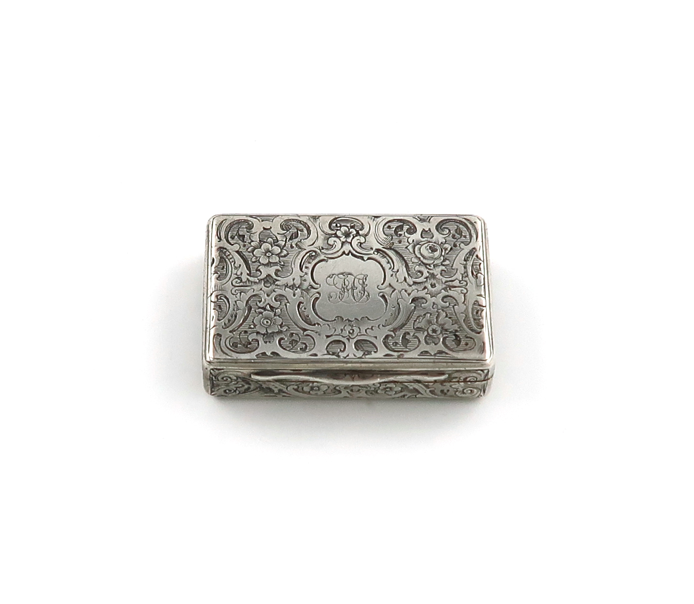 rectangular form, foliate scroll decoration, the hinged cover with an initialled cartouche, the base with a folly in a landscape, gilt interior, hinged pierced foliate grille, length 4cm, approx. weight 1oz.