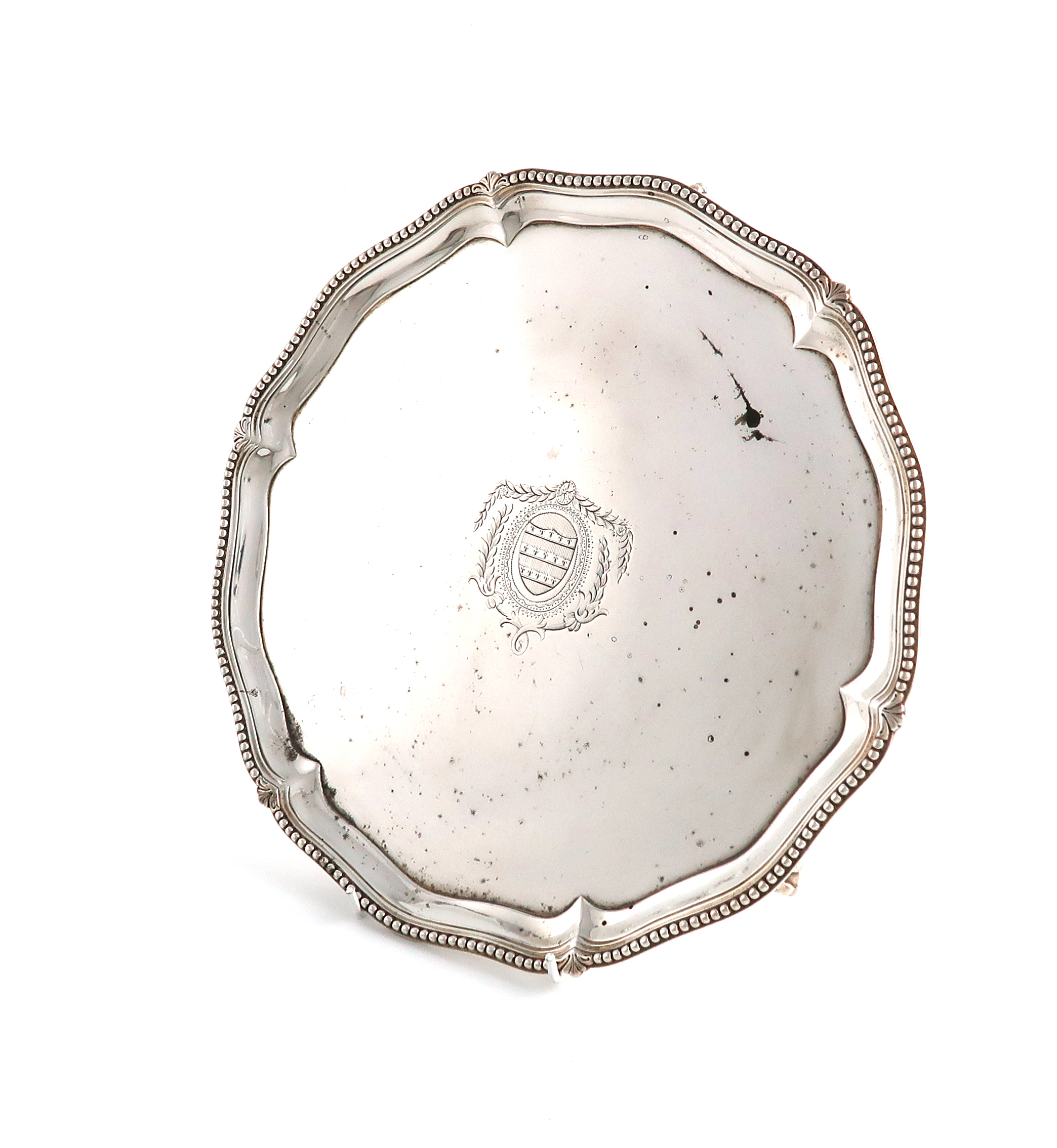 circular form, moulded bead and shell border, the centre with an armorial within foliate mantling, on three ball and claw feet, diameter 28cm, approx. weight 23.8oz.