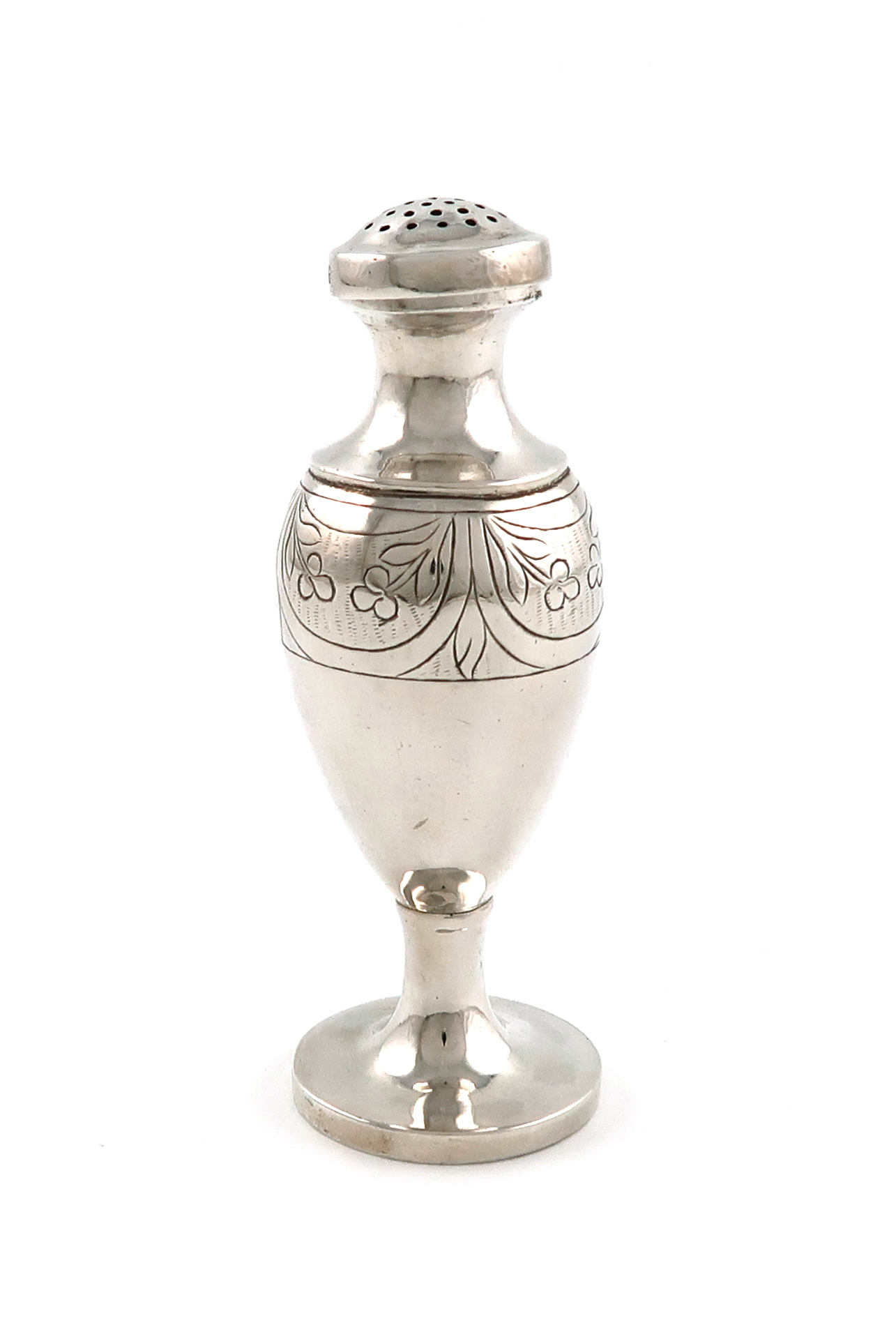 vase form, engraved floral decoration, plain pierced pull-off cover, on a raised circular foot, height 10.4cm, approx. weight 2.4oz.