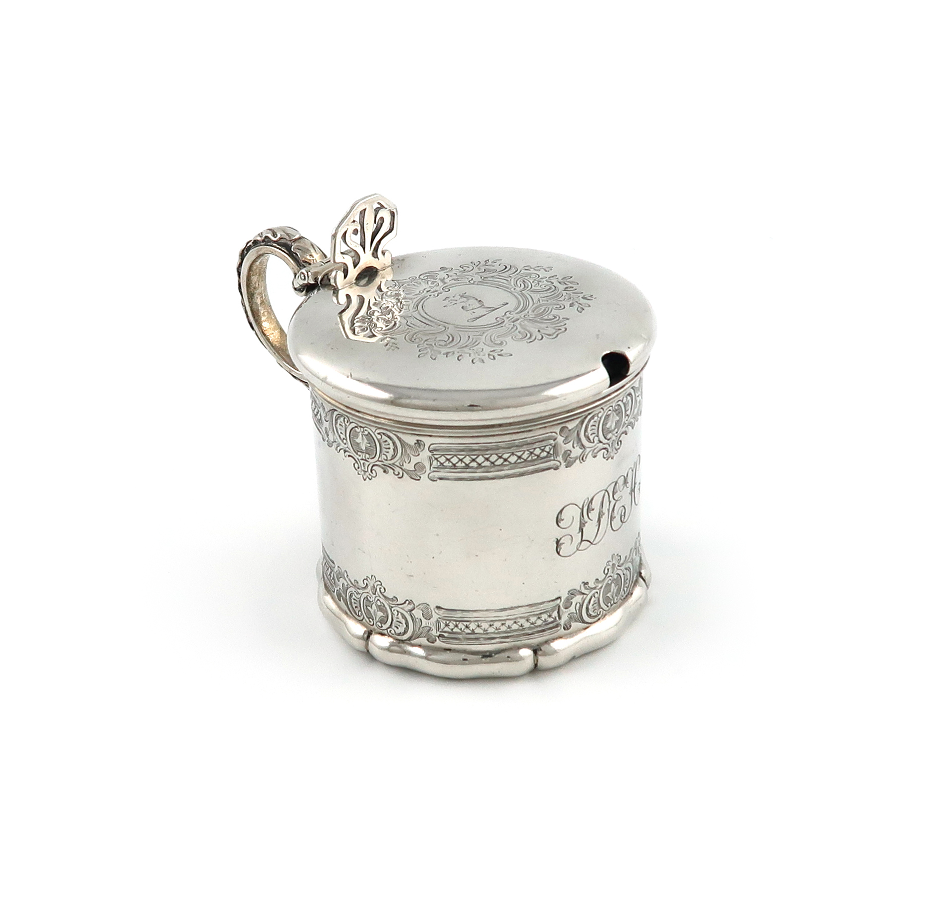 circular form, the sides with chased borders of foliate cartouches between quilted bands and engraved with initials, leaf-capped scroll handle with a pierced foliate scroll thumbpiece, the hinged cover with a crest within foliate mantling, moulded spread foot, blue glass liner, diameter 6.8cm, approx. weighable 4.8oz.