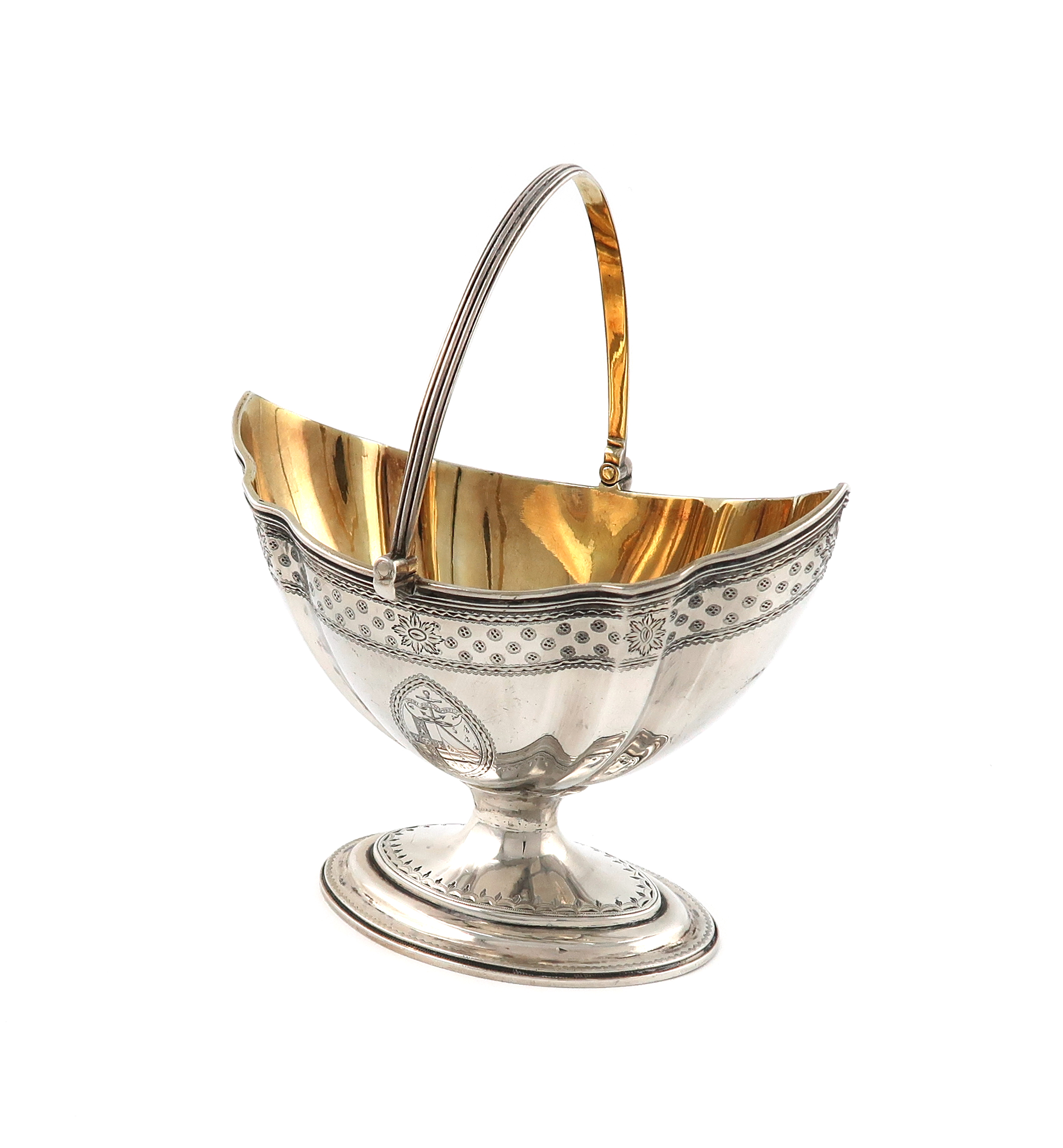 shaped oval form, bright-cut decoration above two cartouches, one with an armorial, reeded border and swing handle, gilt bowl, on a raised oval foot with bright-cut decoration, length 5.4cm, approx. weight 10.6oz.