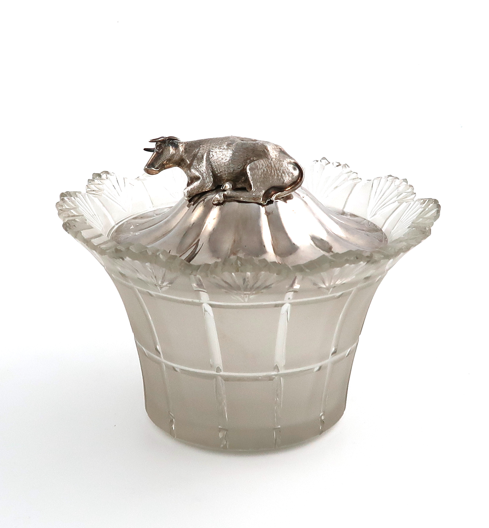 tapering frosted glass body, the pull-off cover with a recumbent cow finial, height 11.5cm, approx. weighable 1.7oz.