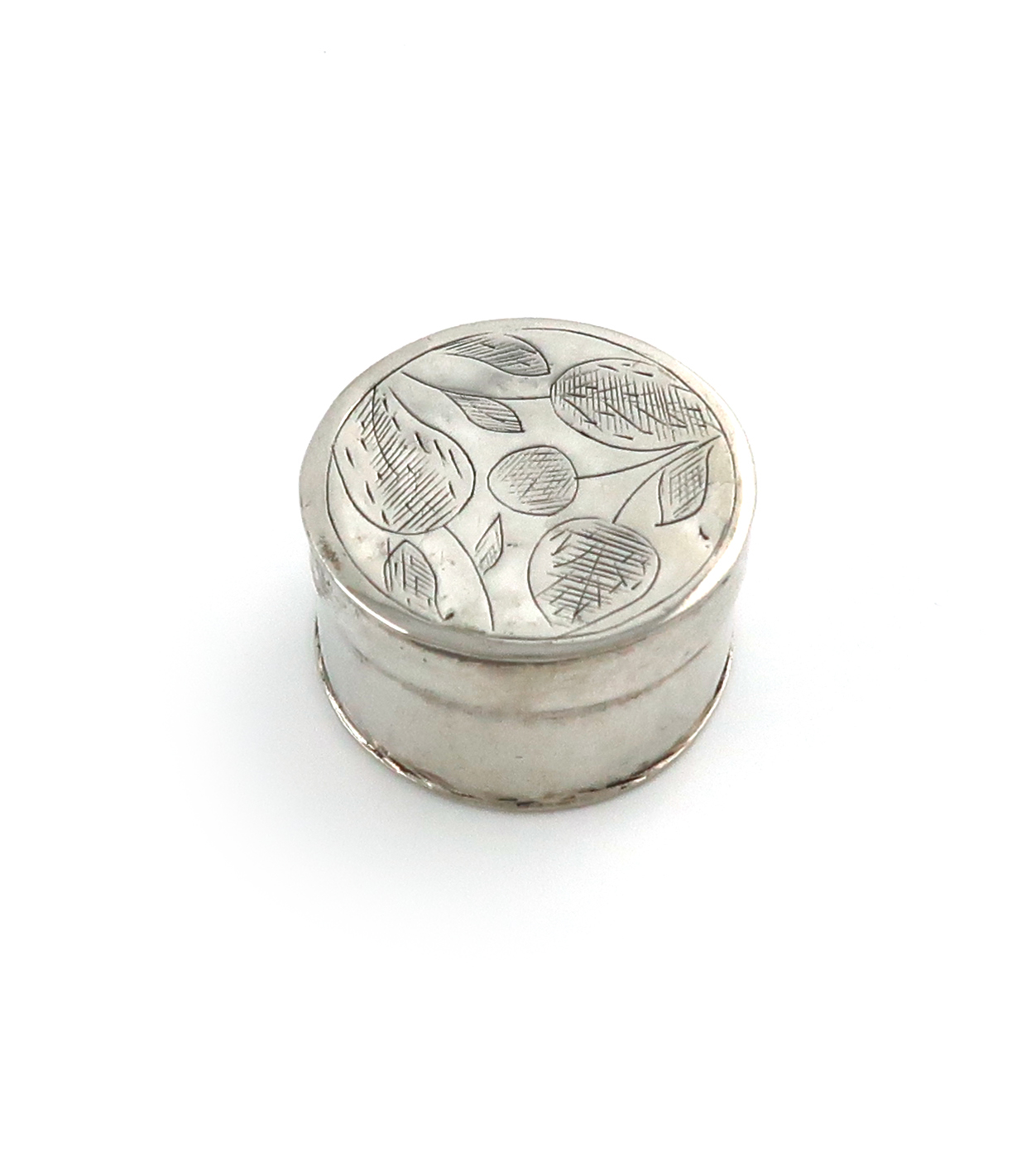 circular form, the pull-off cover with foliate decoration, the base with scratch initials 'E.C', diameter 3.2cm, approx. weight 0.5oz.