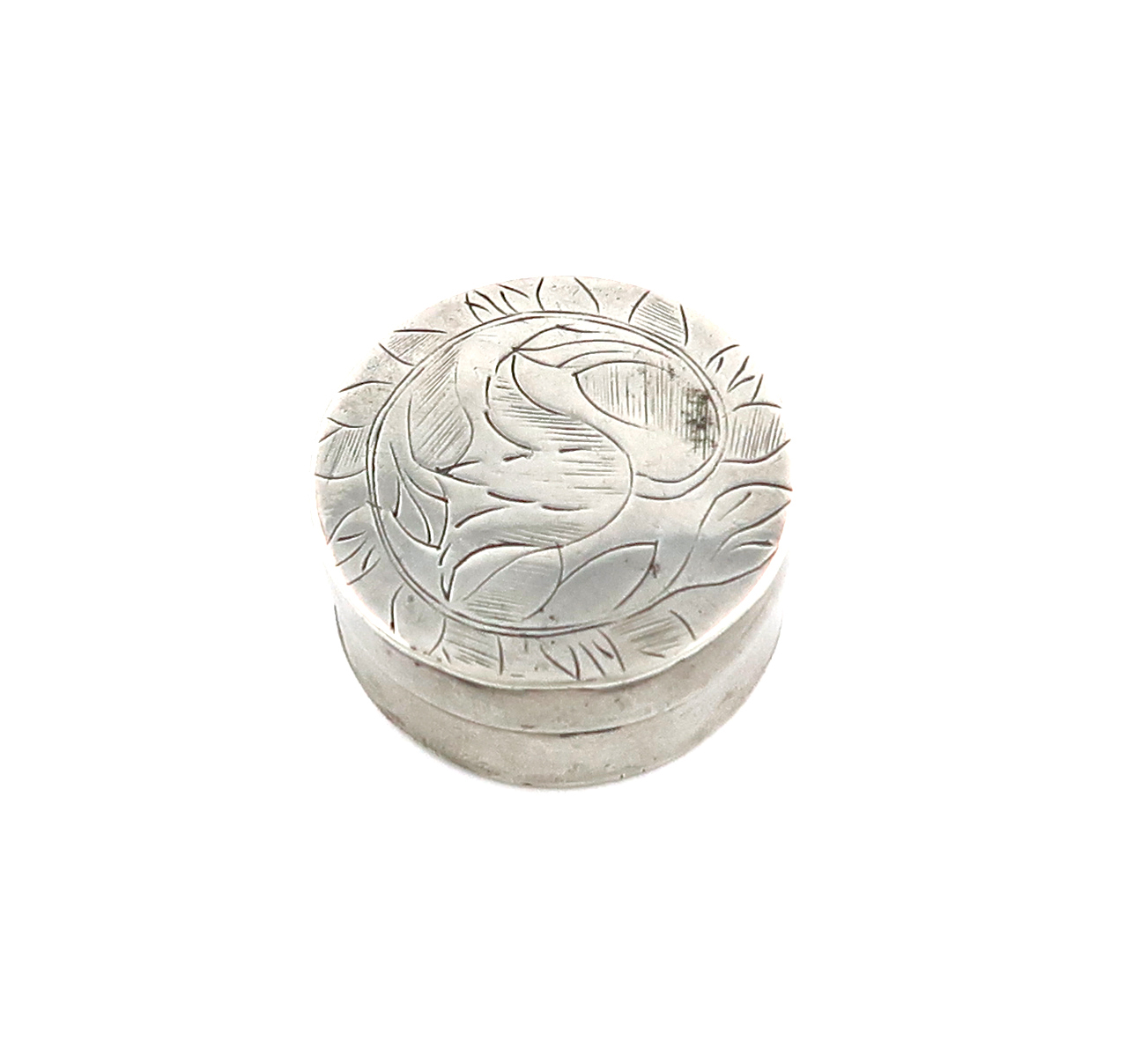 circular form, the pull-off cover engraved with a flower, the base with scratch initials 'W*C' over '1675', diameter 3.2cm, approx. weight 0.4oz.