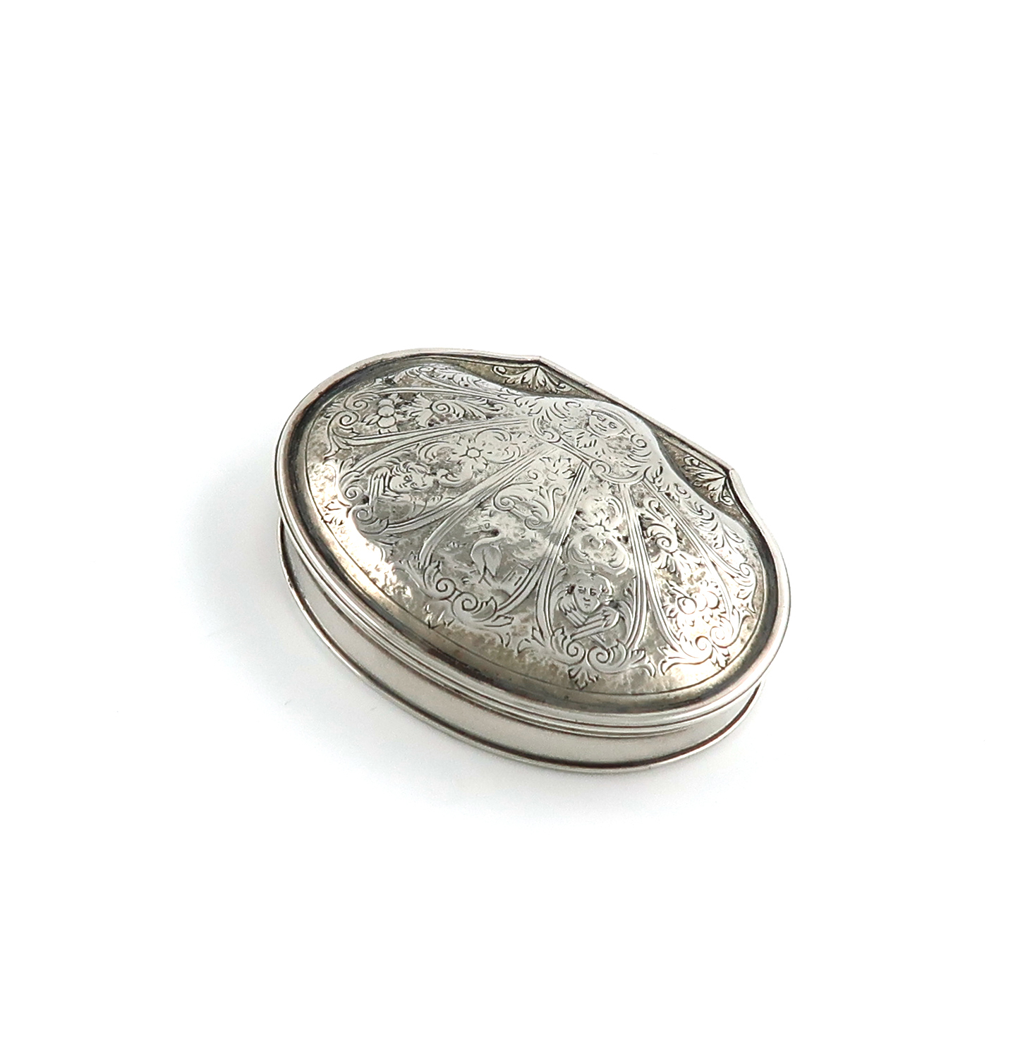 shaped oval form, reeded borders, the hinged cover embossed in the form of a scallop shell, chased with panels of birds and cherubs among foliate scrolls with a mask above, the underside with scratch initials 'R.H', gilt interior, length 6.6cm, approx. weight 1.2oz.