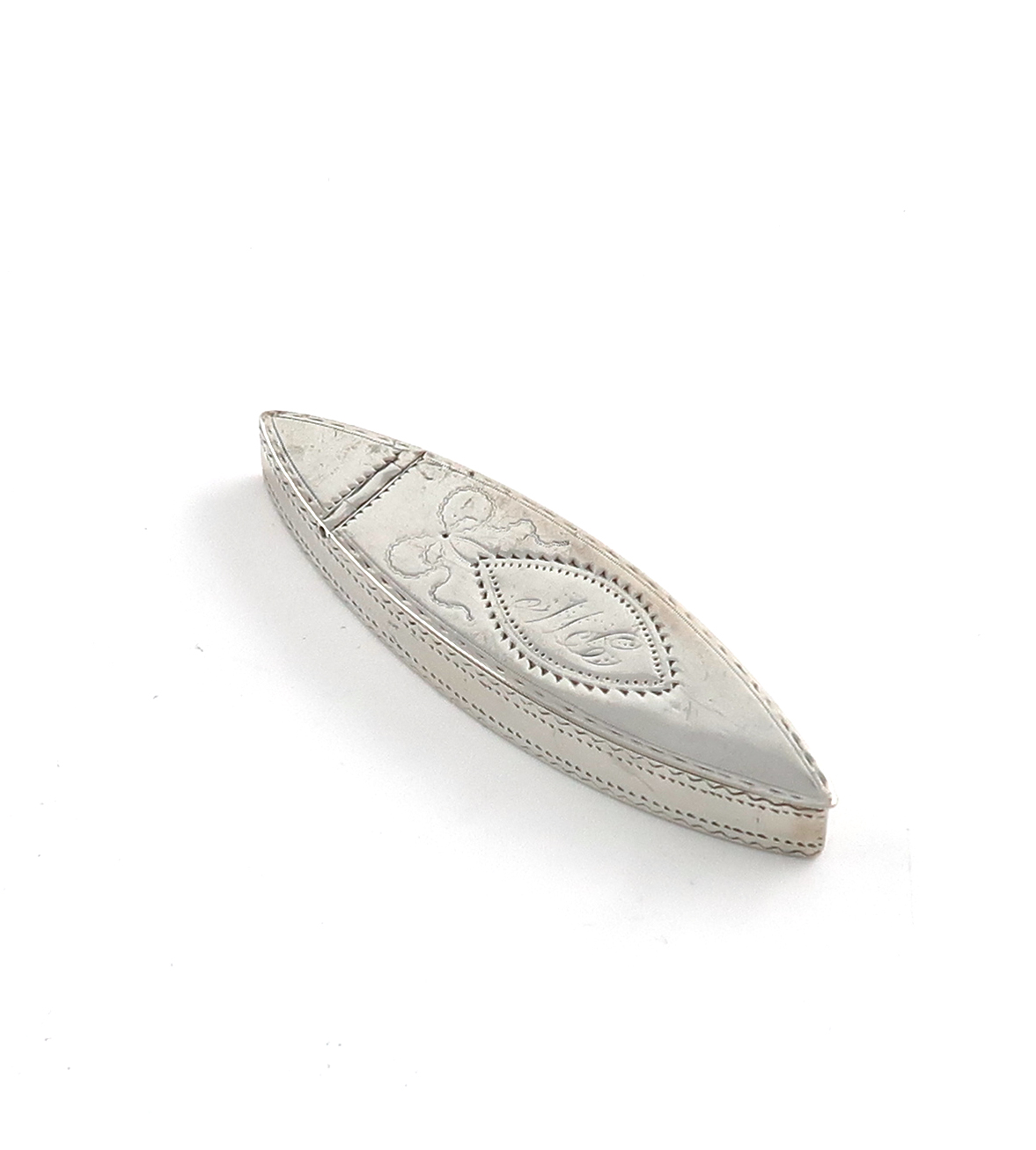 oval navette form, bright-cut decoration, the cover with initials, the interior of the cover with a mirror, length 7.4cm, approx. weight 0.5oz.
