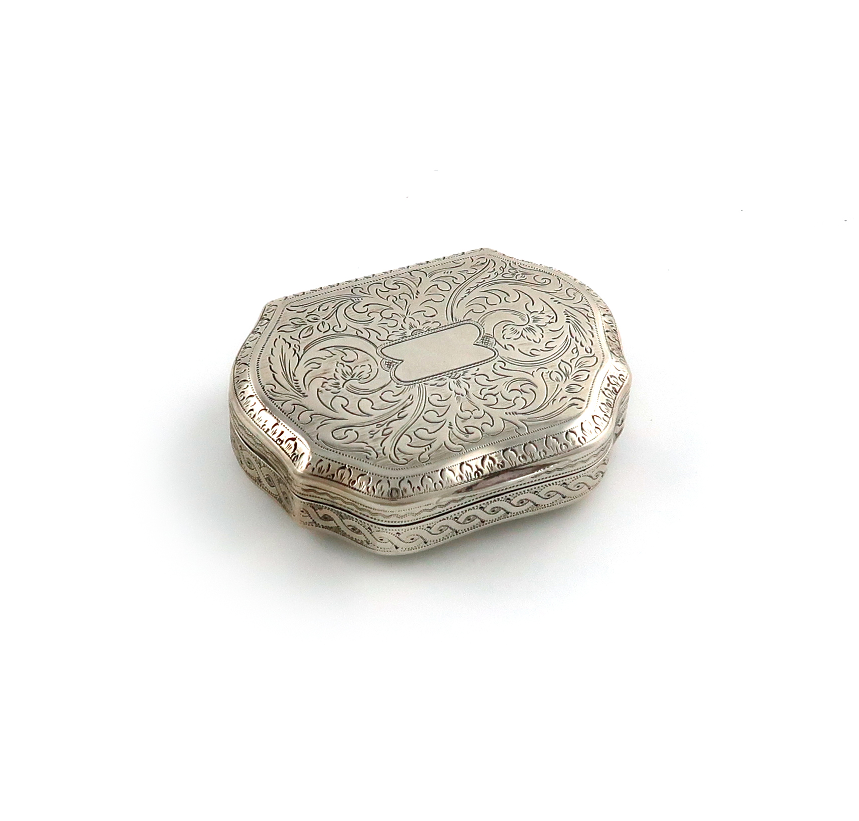 cartouche form, foliate scroll decoration and vacant cartouche, gilt interior, length 6.6cm, approx. weight 1.9oz.
