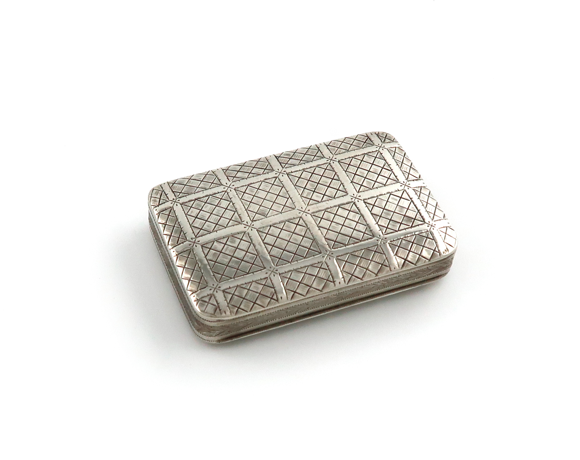 rounded rectangular form, reticulated decoration, gilt interior, length 6.2cm, approx. weight 1.3oz.