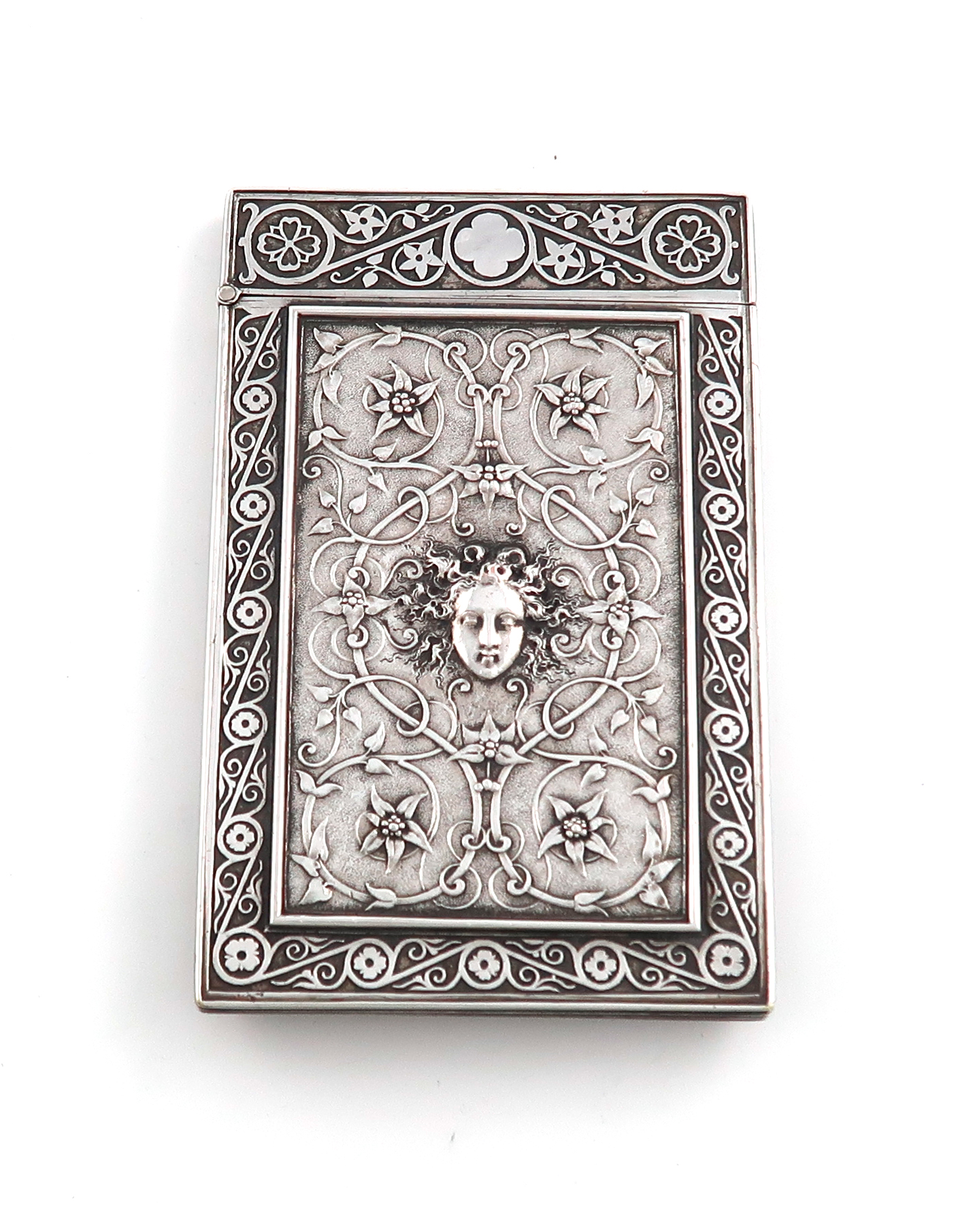 rectangular form, with a classical maiden mask with foliate decoration, on a matted background, stylised borders, hinged cover, in a fitted case, length 10.7cm
