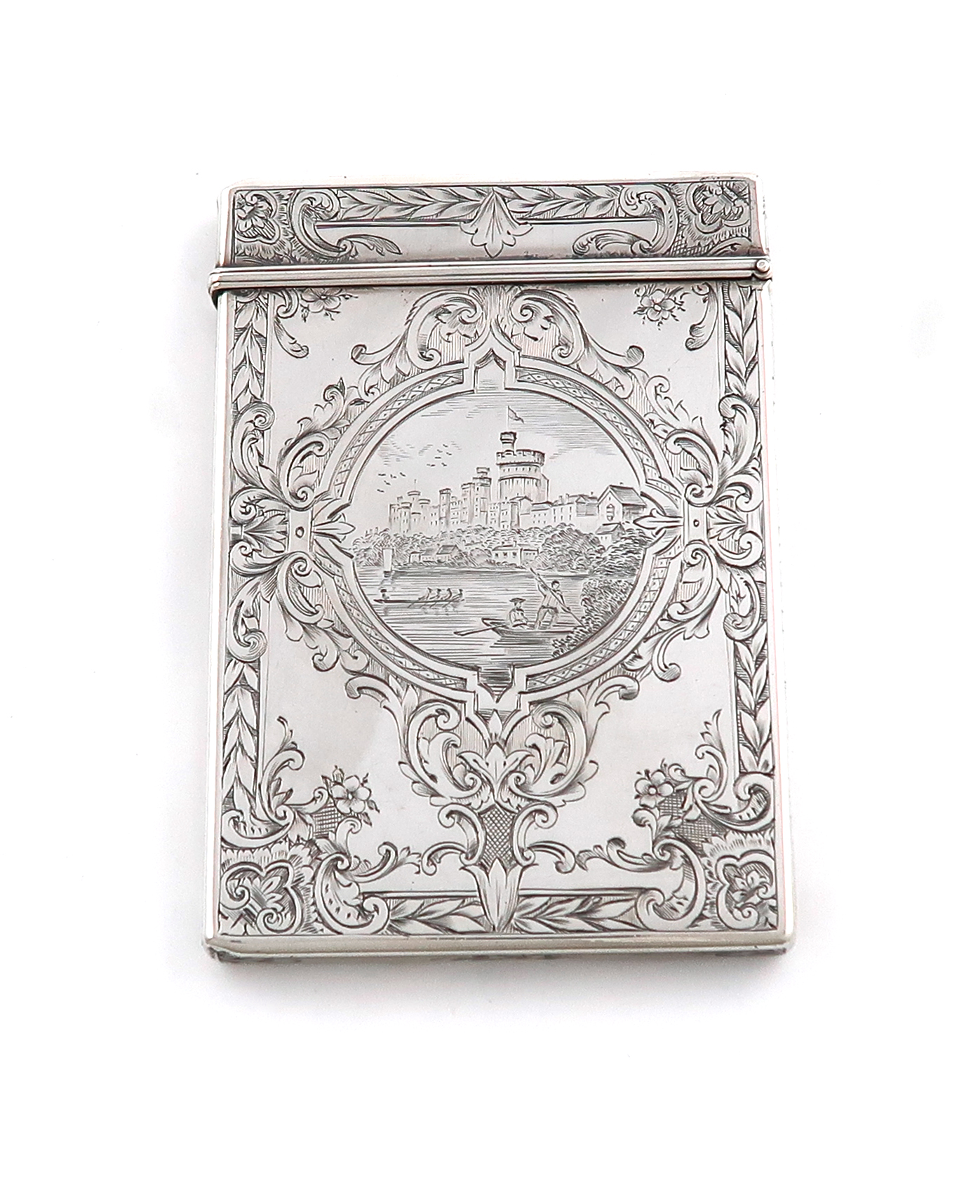 A Victorian silver engraved 'castle-top' card case, Windsor Castle,