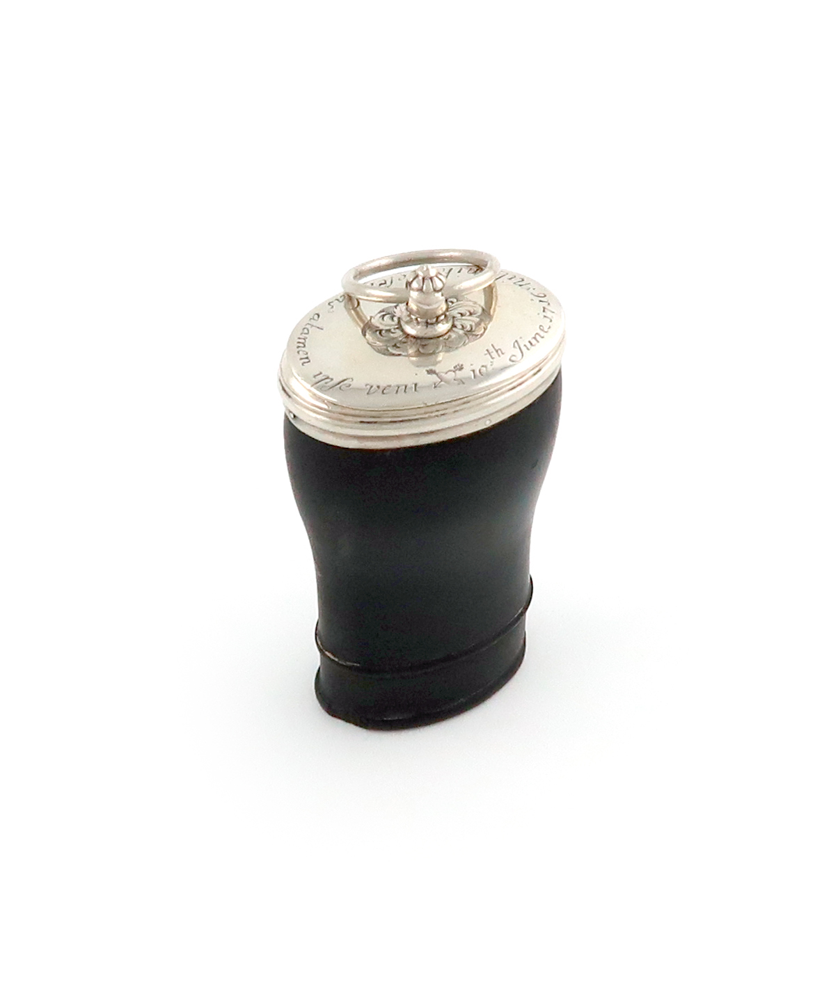 waisted oval form, the pull-off cover with engraved foliate scrolls around a ring attachment, inscribed '10th June 1716 nil mihi rescribas atamen ipse veni', height 7.5cm.