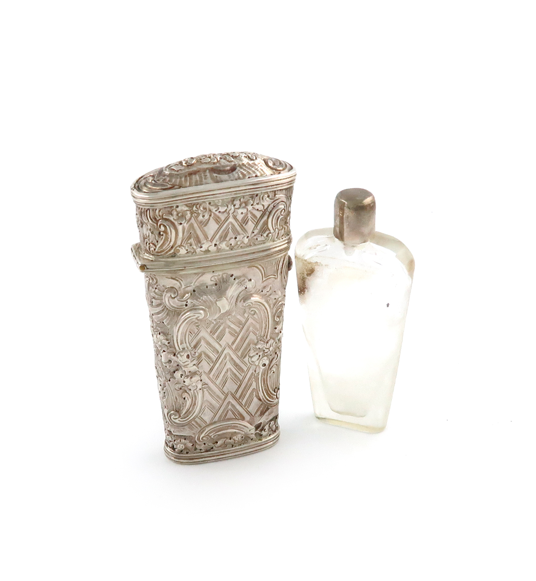 tapering oblong form, chased foliate scroll decoration around overlaid lozenges, the front with a push button clasp, hinged cover, the interior with a base metal mounted glass scent bottle, lined with blue velvet, length 9.5cm, approx. weighable 1.4oz.