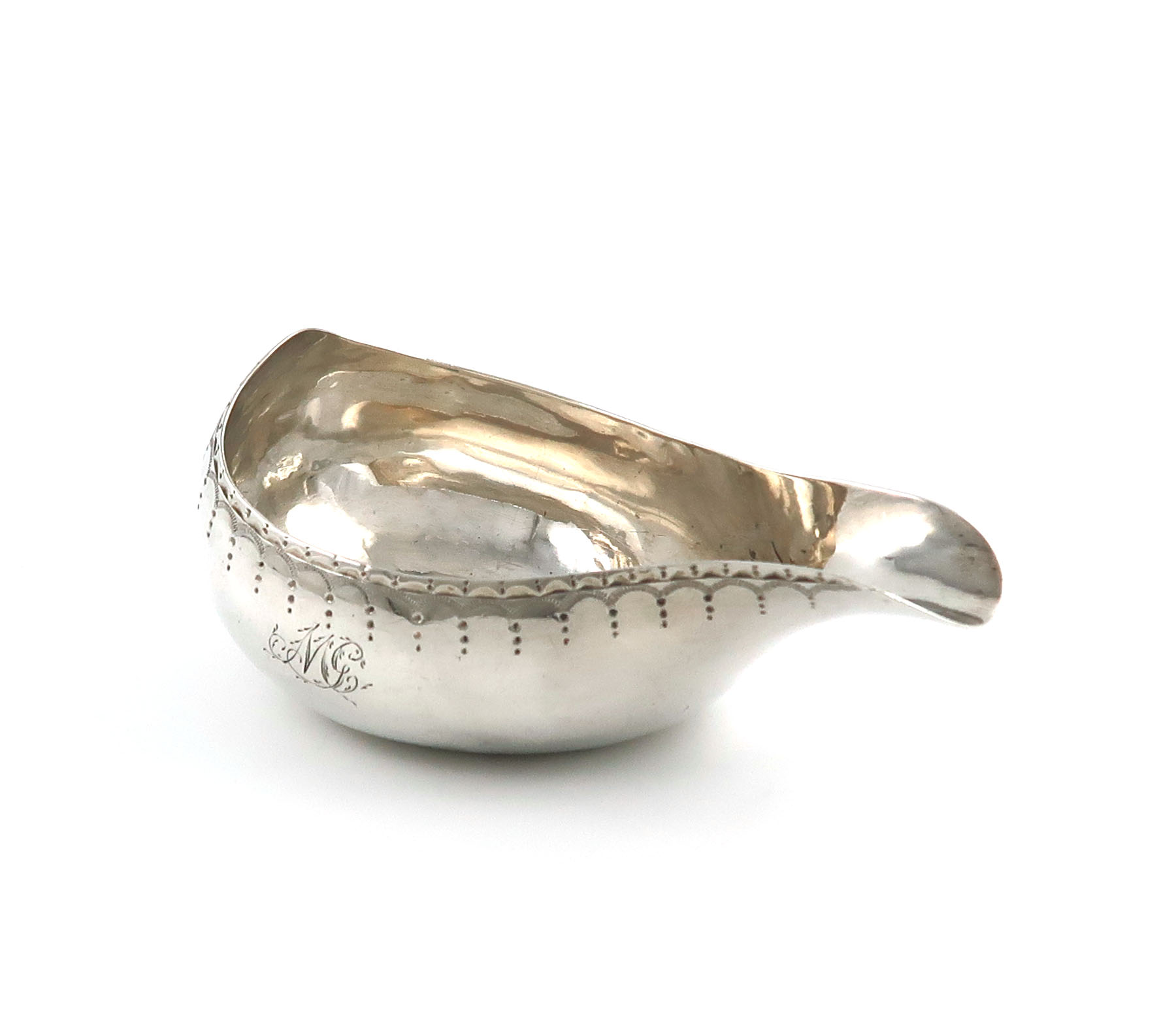 oval form, bright-cut border, initialled to the side, length 11cm, approx. weight 1.4oz.