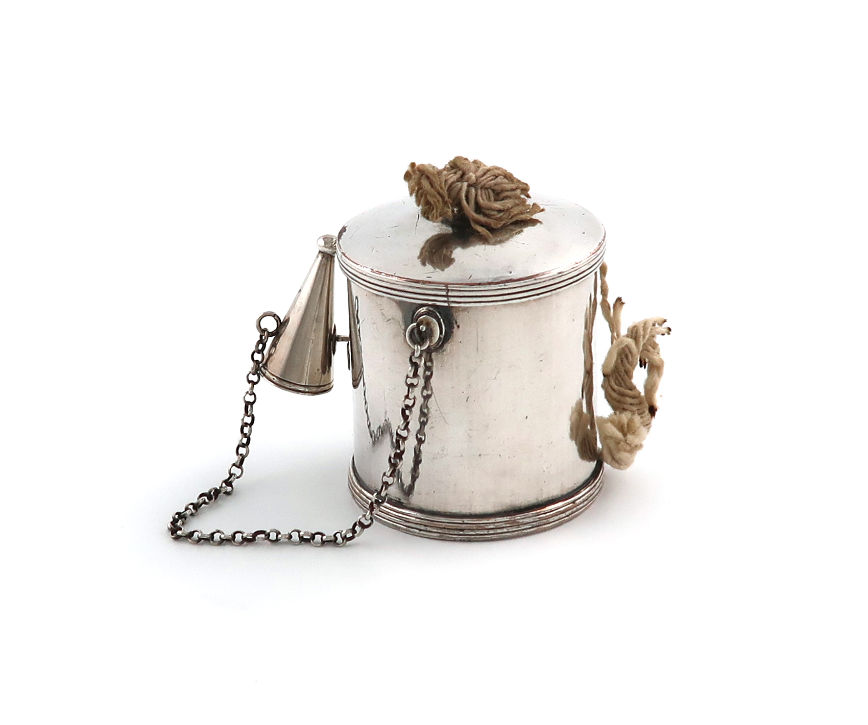 plain cylindrical form, reeded borders, and scroll handle, with a conical snuffer and chain, height 7cm.