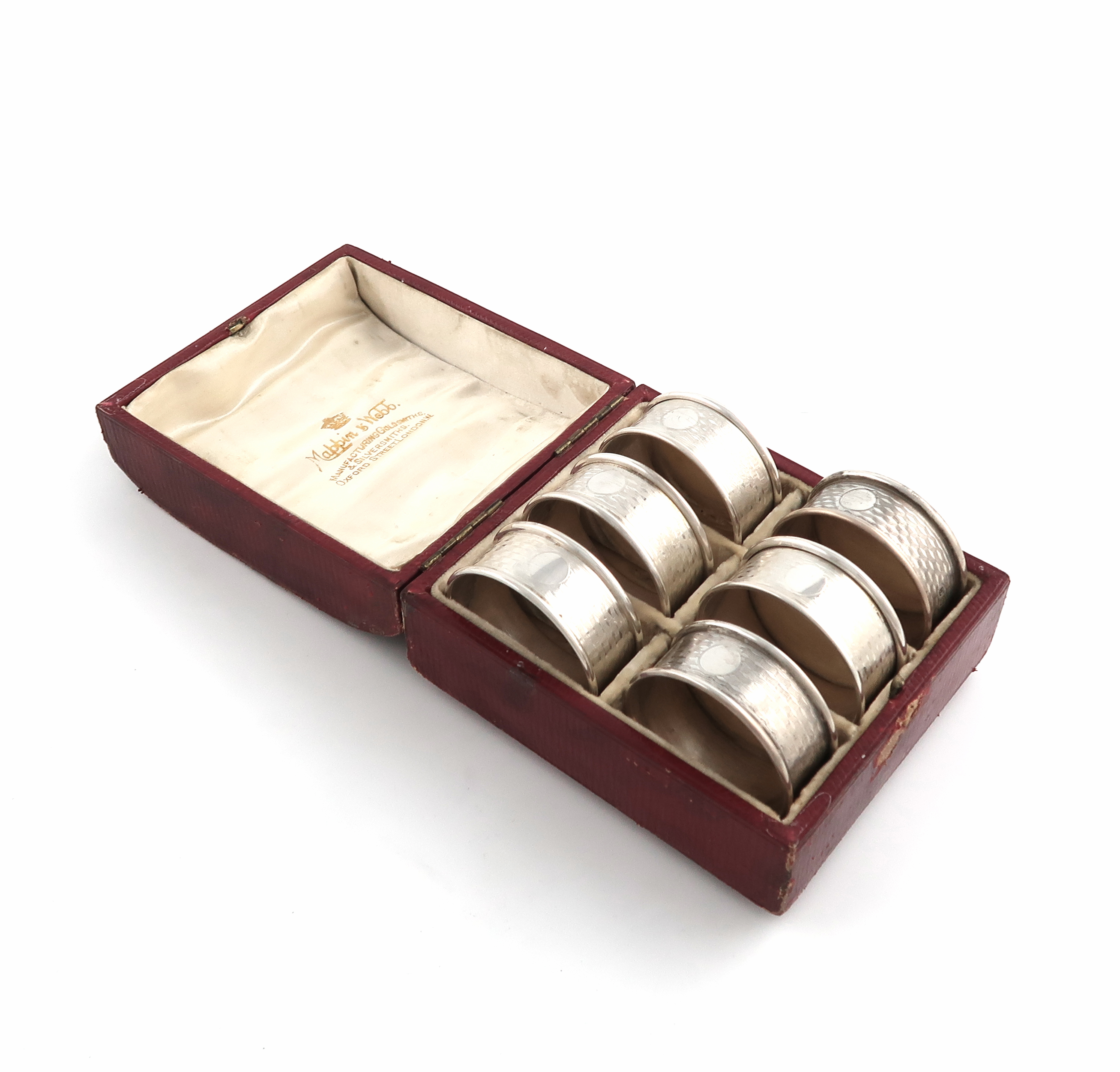 circular form, engine-turned decoration, in a fitted case, approx. weight 1.5oz. (6)