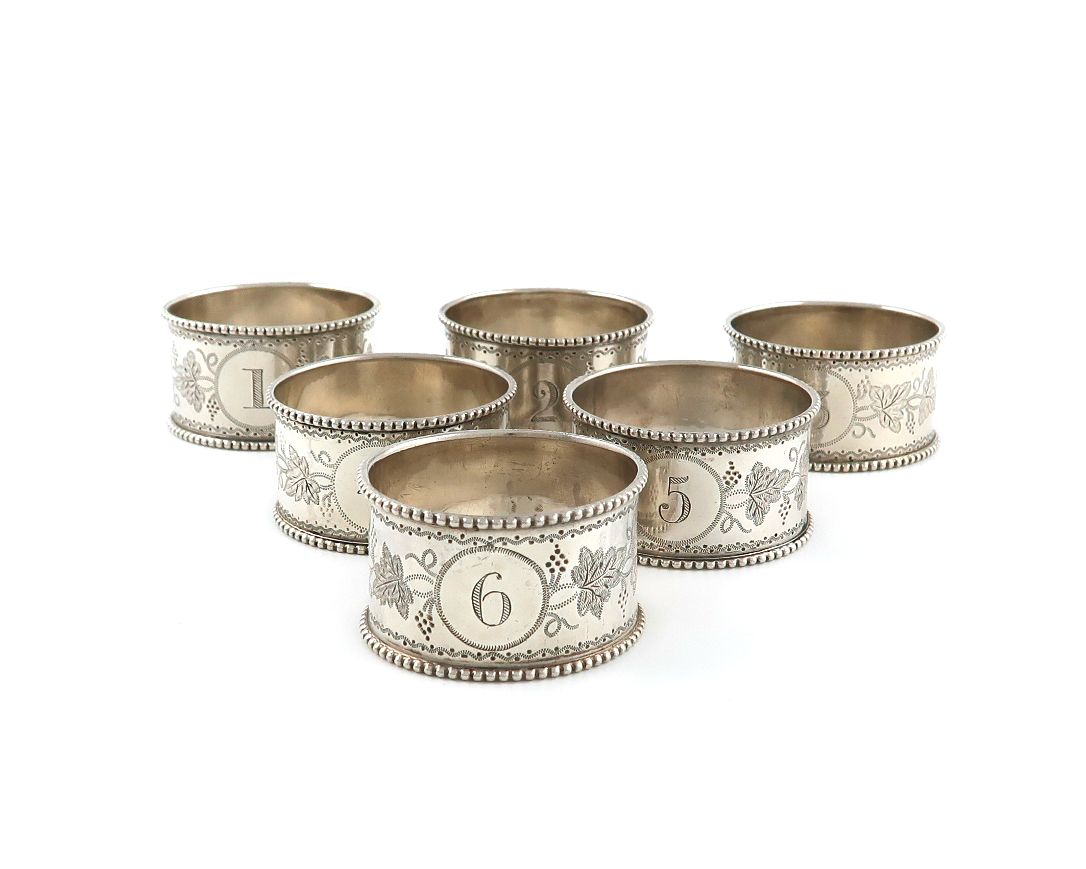 circular form, beaded border, with trailing vines around cartouches numbered one to six, diameter 4.7cm, total approx. weight 4.6oz. (6)