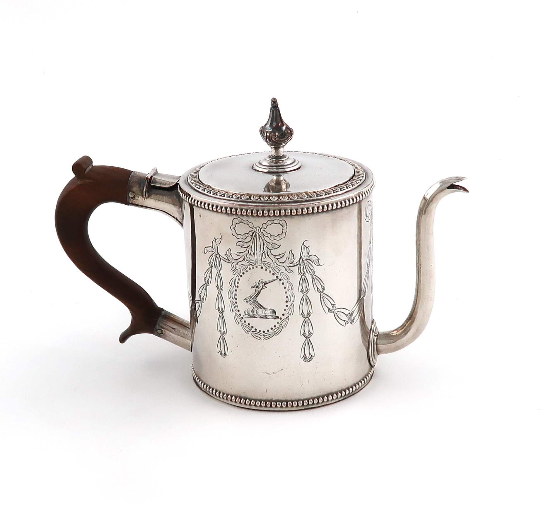 cylindrical form, beaded borders, wooden scroll handle, the socket of the handle with a hinged cover for water, foliate border with a pull-off cover, engraved ribbon-tied decoration, height 12.5cm.