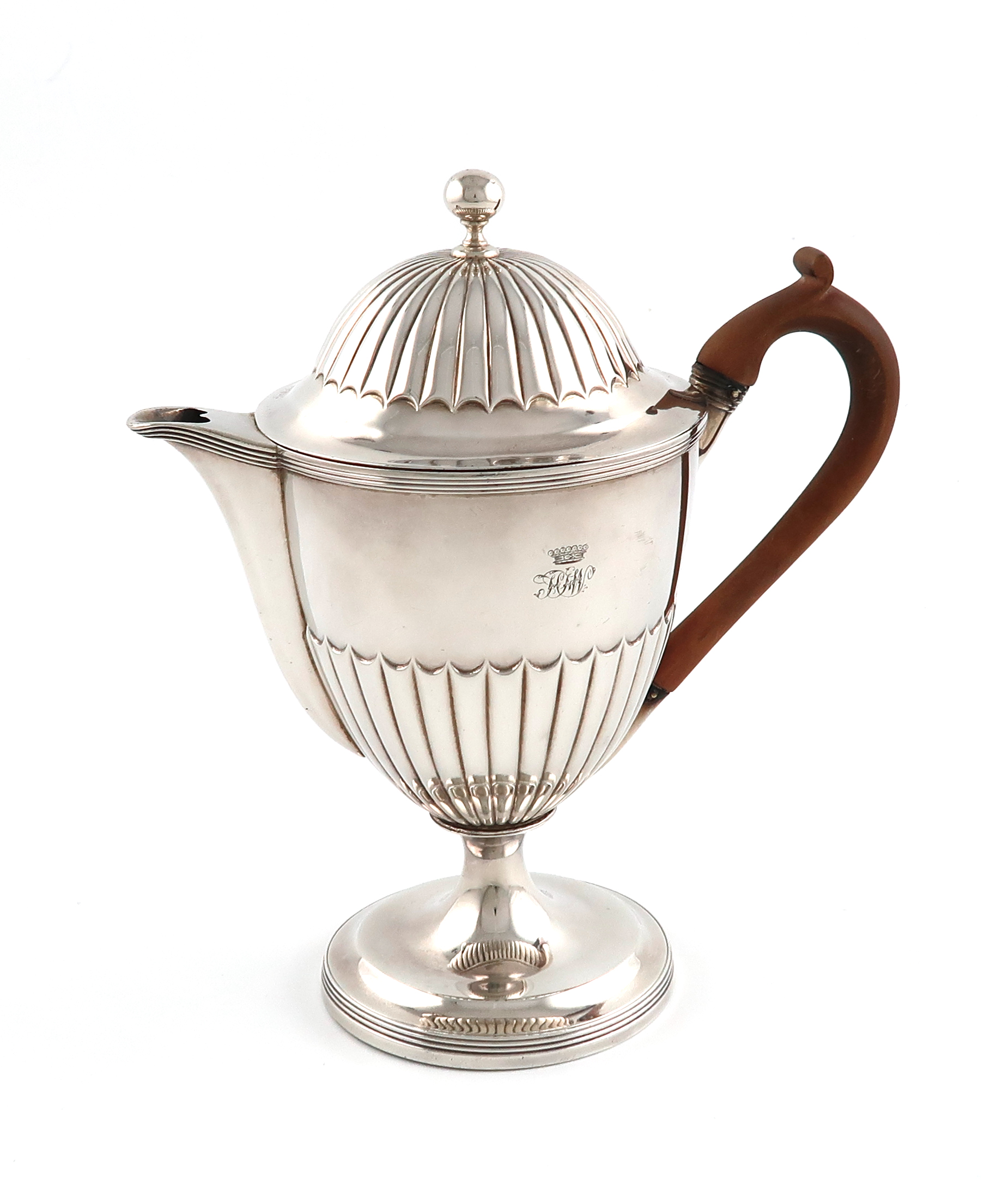 vase form, part-fluted decoration, scroll handle, raised pull-off cover with a ball finial, the interior with a cylindrical old Sheffield plate heating compartment with a pull-off cover, on a raised circular foot, engraved with a crowned monogram, height 19.7cm, approx. weighable 13oz.