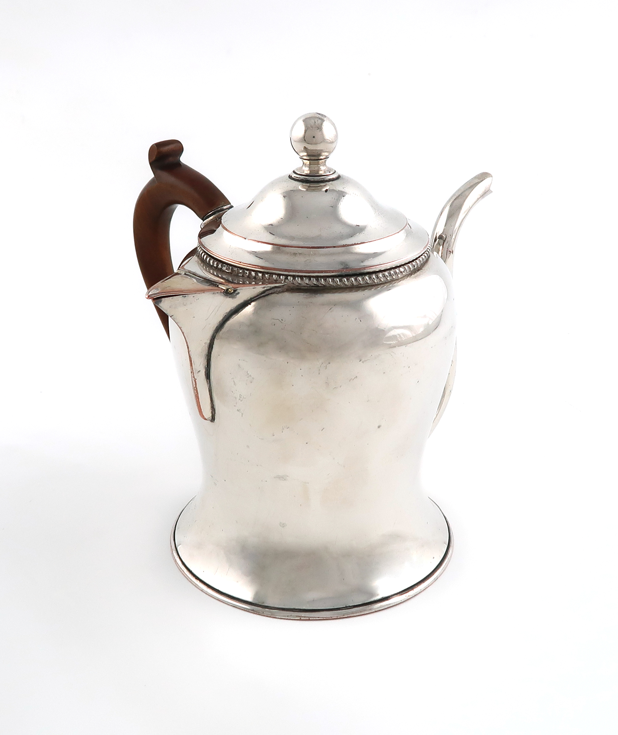 baluster form, gadroon border, scroll handle, the water compartment with a hinged cover, pull-off cover with a ball finial, height 16cm.