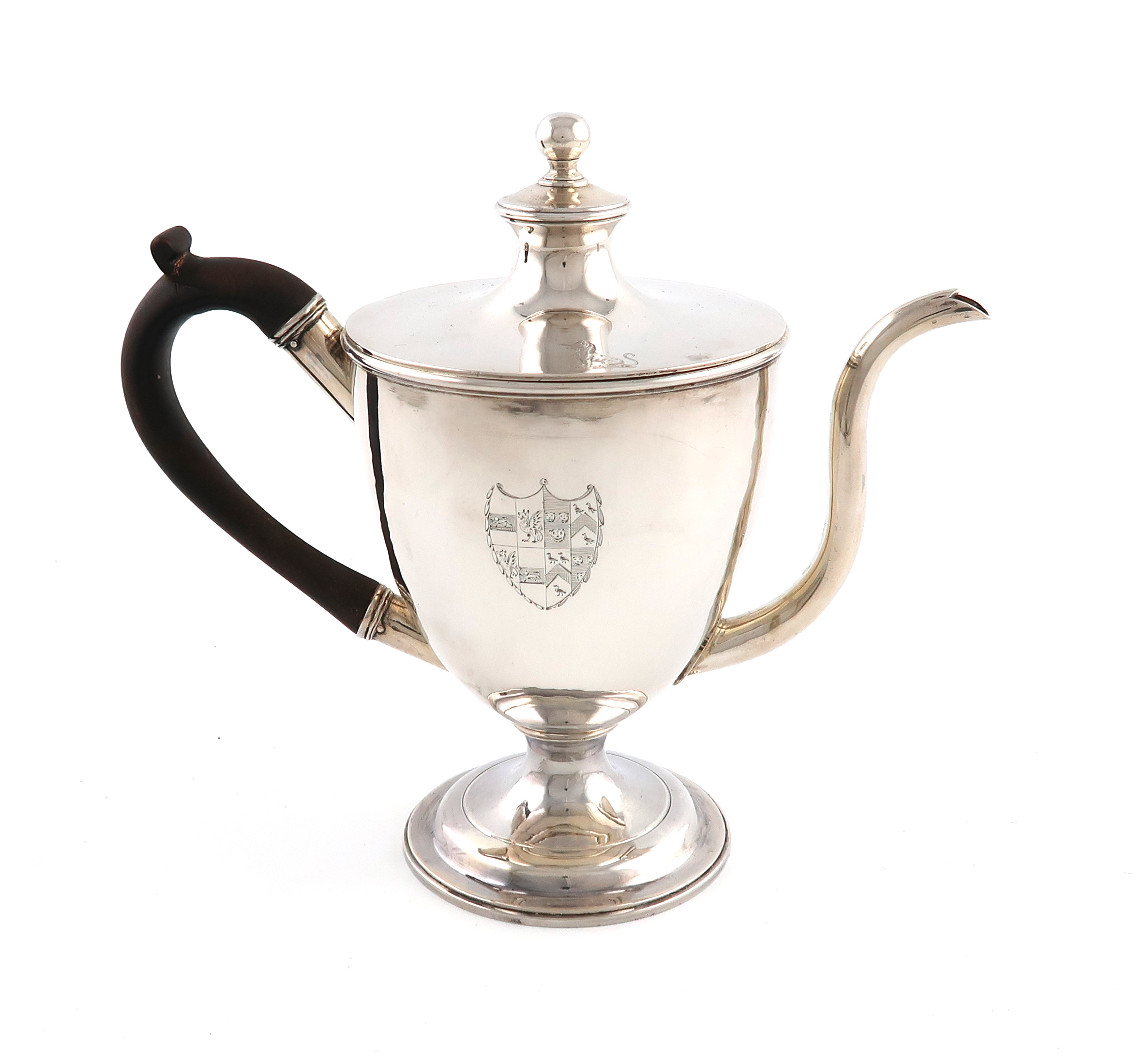 plain vase form, scroll handle, raised pull-off cover with a ball finial, the interior with a tapering heating compartment with a pull-off cover, on a raised circular foot, engraved with an armorial shield and crest, height 17cm, approx. weight 13.8oz.