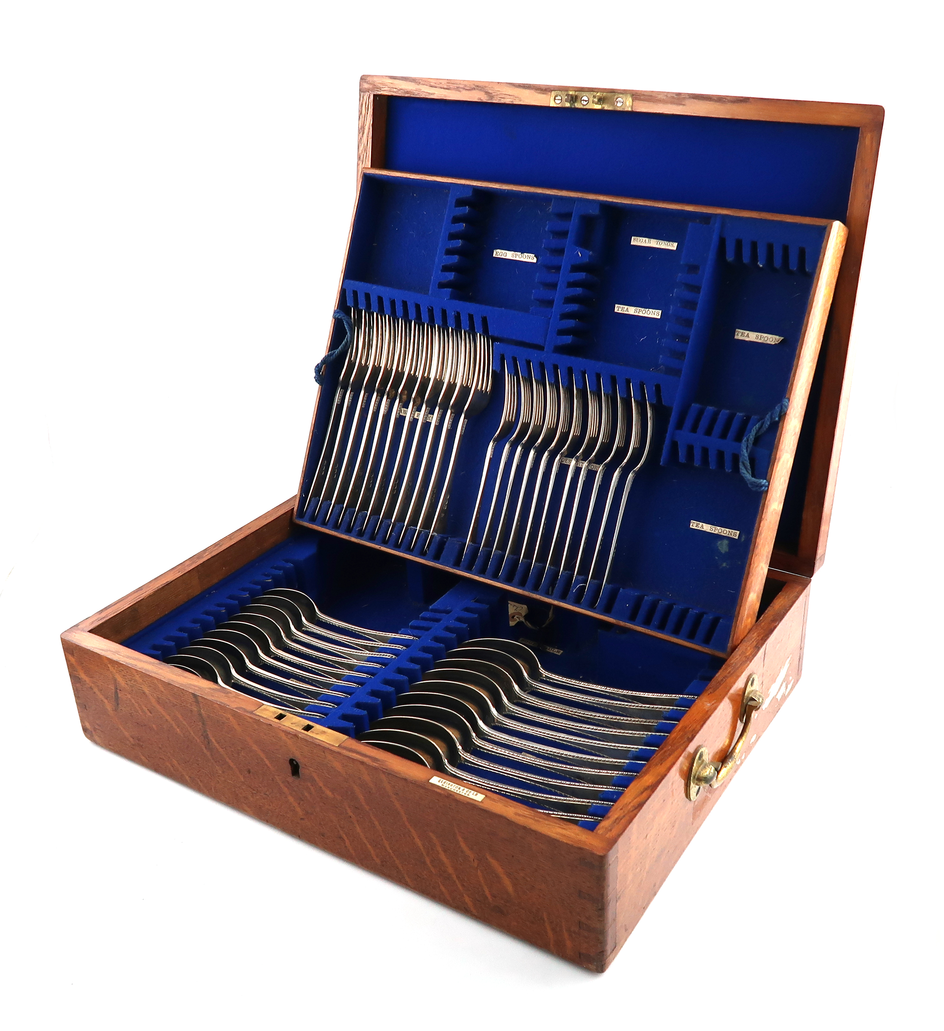 the terminals with a crest, comprising: twelve tablespoons, twelve table forks, twelve dessert spoons and twelve dessert forks, in a fitted wooden case, approx. weight 92oz.