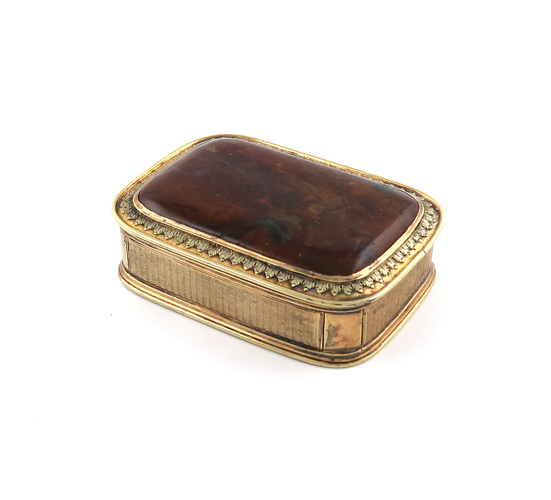 of rounded rectangular form, the hinged cover and base set with agate panels and the cover decorated with a foliate border, length 8.5cm.