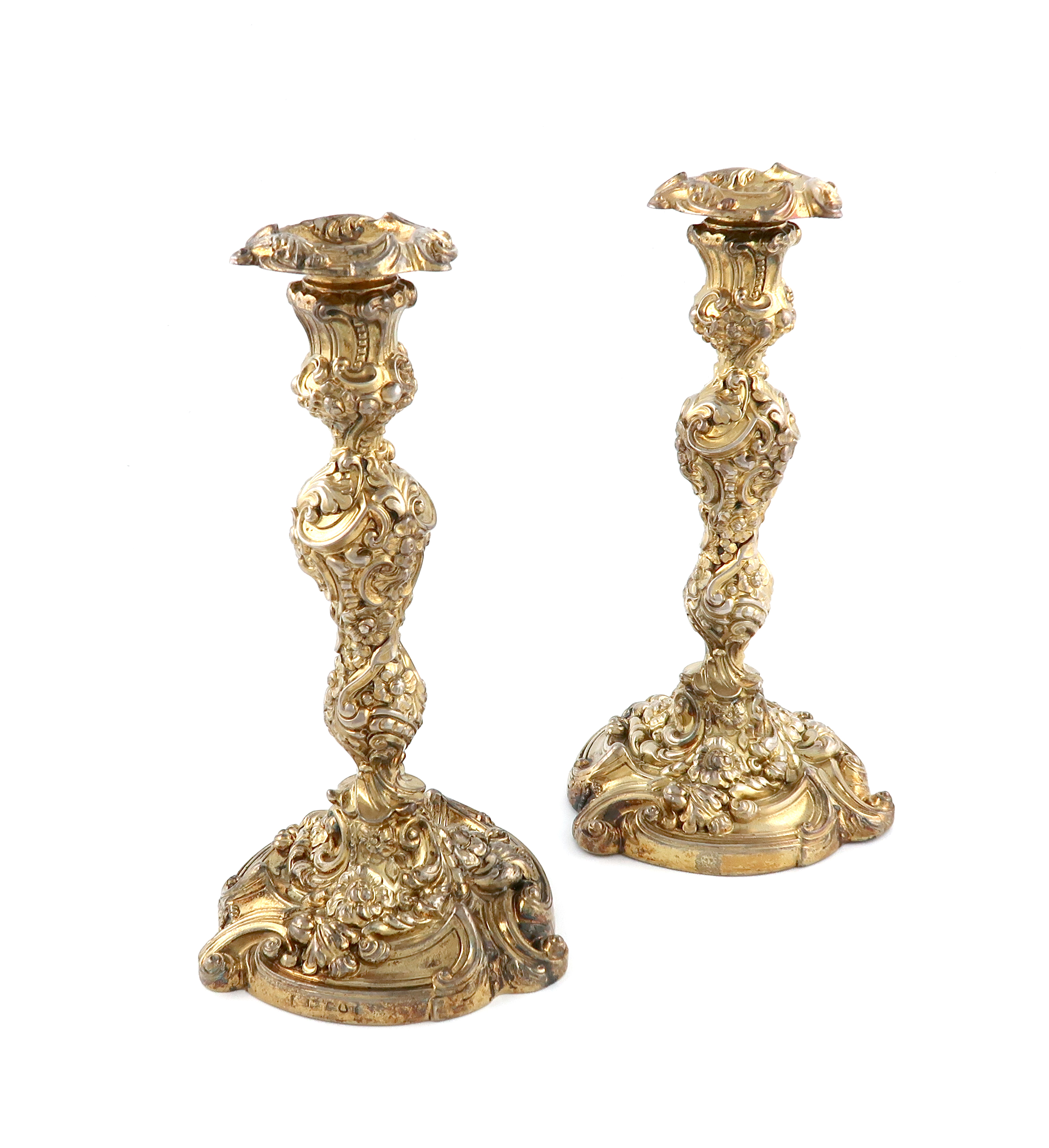 baluster stems, foliate scroll decoration, detachable scroll drip pans, engraved with a crest, on raised foliate scroll bases, also engraved with a crest, height 27.5cm. (2)