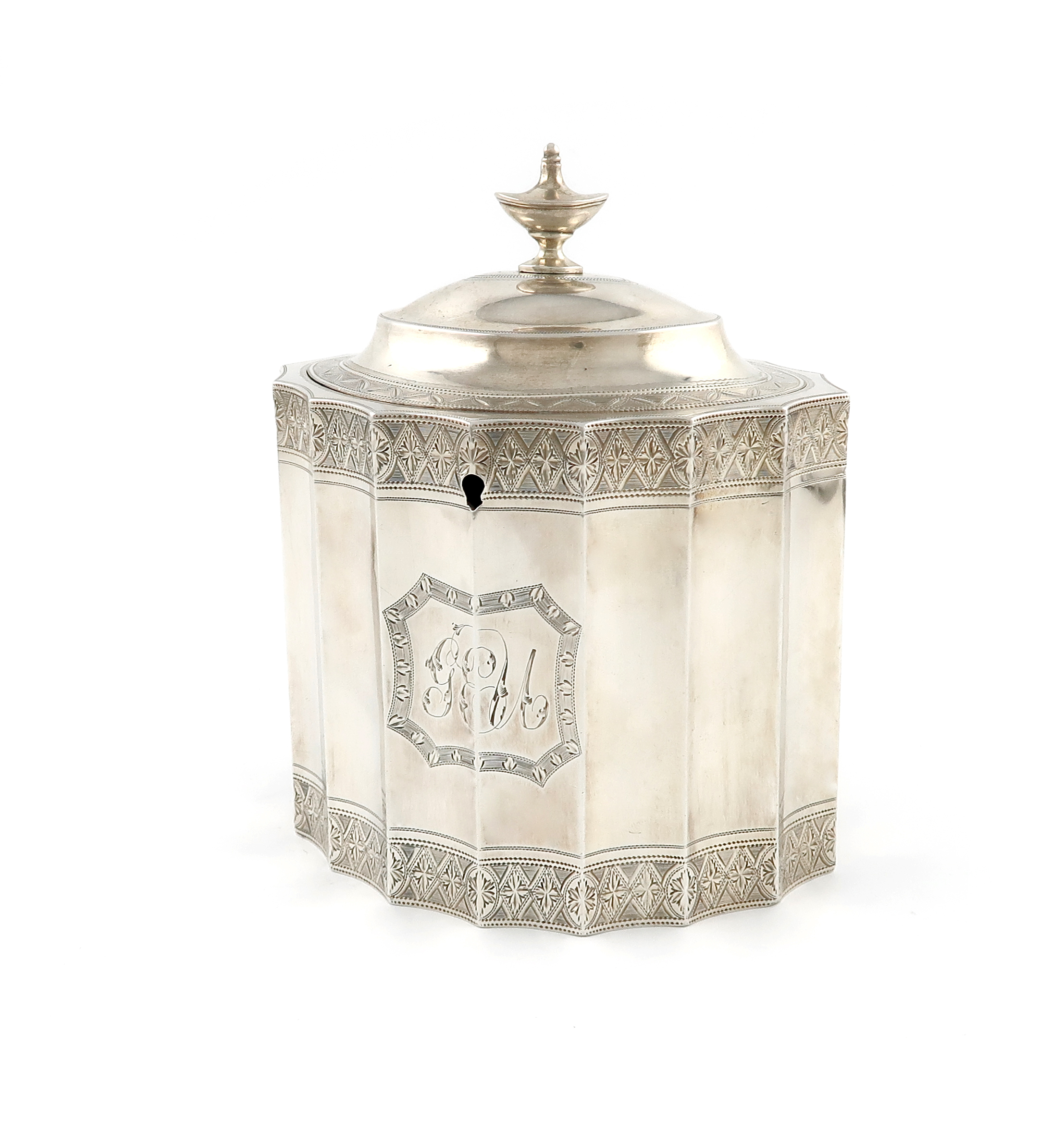 fluted oval form, bright-cut decoration, initialled cartouche, the flush-hinged cover with bright-cut decoration and an urn finial, with key, height 15.7cm, approx. weight 13oz.