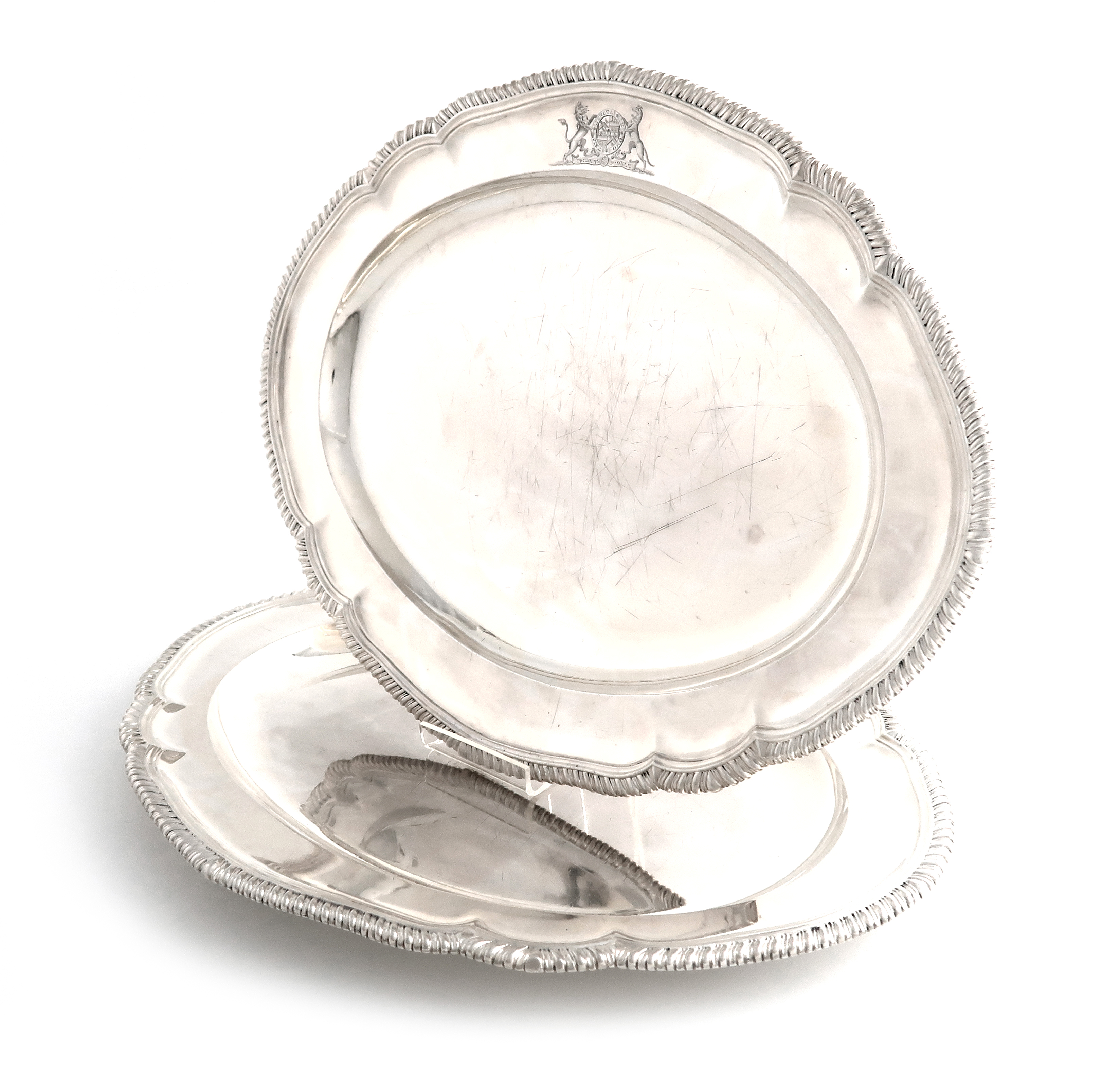 shaped oval form, gadroon border, engraved with an armorial, length 41cm, total approx. weight 87.2oz. (2)