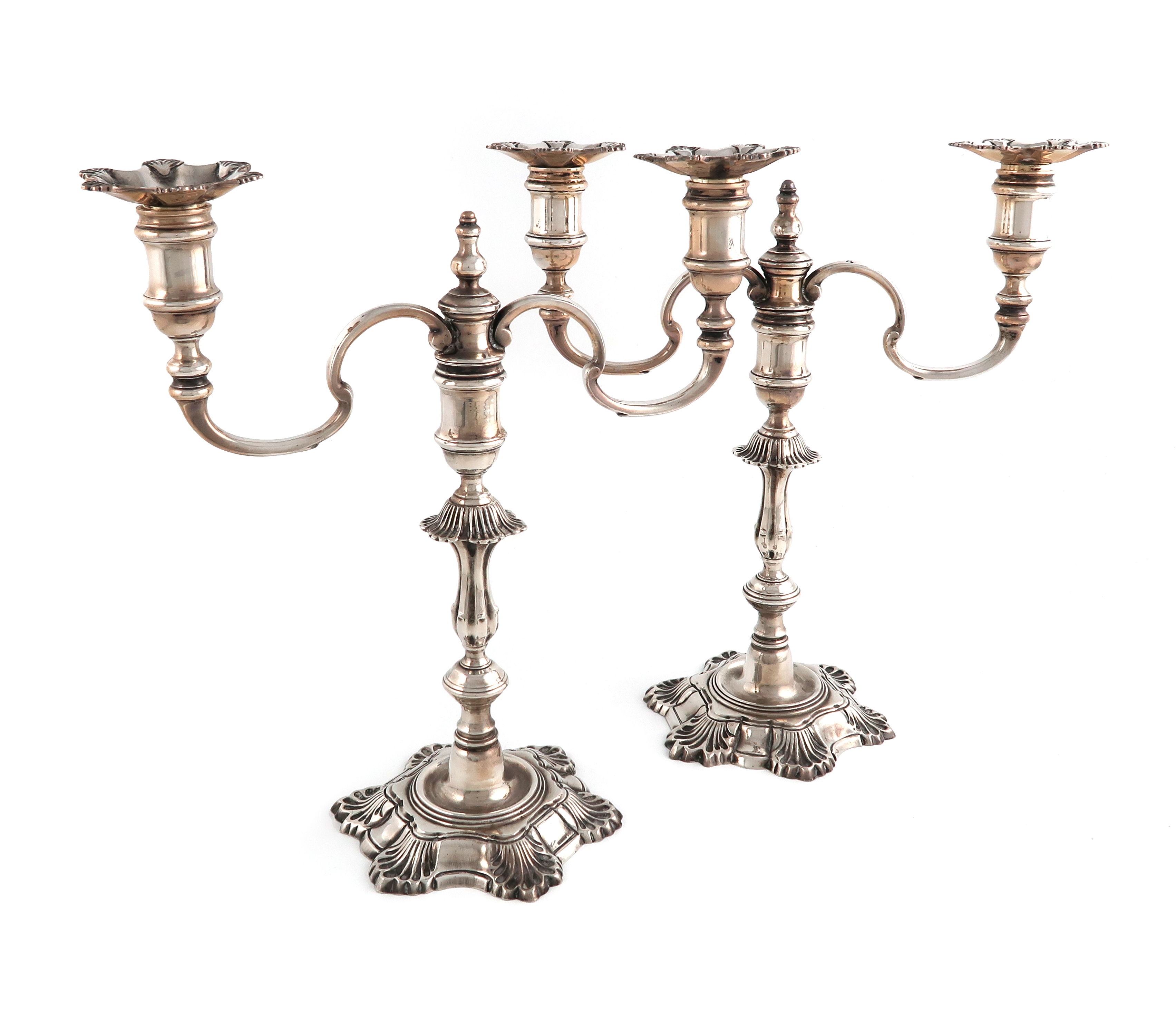 in the mid-18th century manner, knopped baluster stems, plain scroll arms, spool-shaped capitals, removable drip pans, with a central knop finial, on raised shaped circular bases with shell motifs, height 29.5cm, approx. weight 69.5oz. (2)