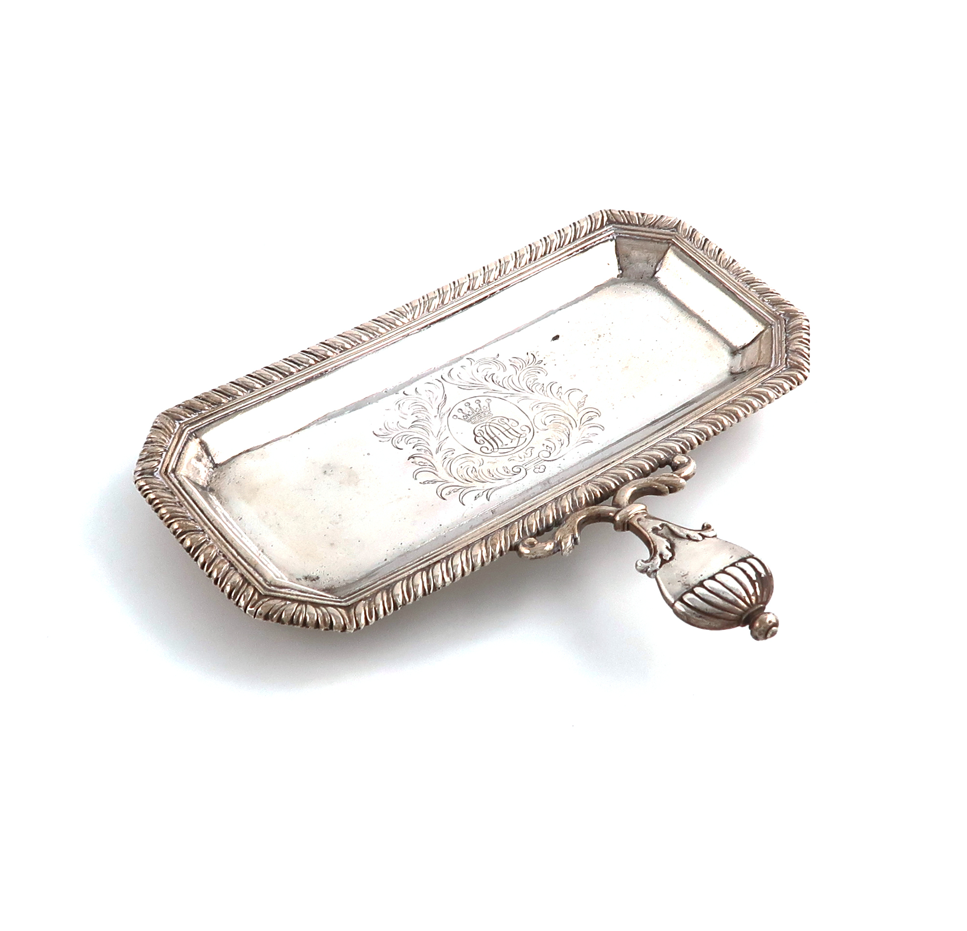 rectangular form, canted corners, gadroon border, leaf and scroll capped fluted baluster handle, the centre engraved with a crowned cipher within foliate scroll mantling, on four bun feet, the underside with a scratch weight '5-16', length 16.2cm, approx. weight 5.5oz.