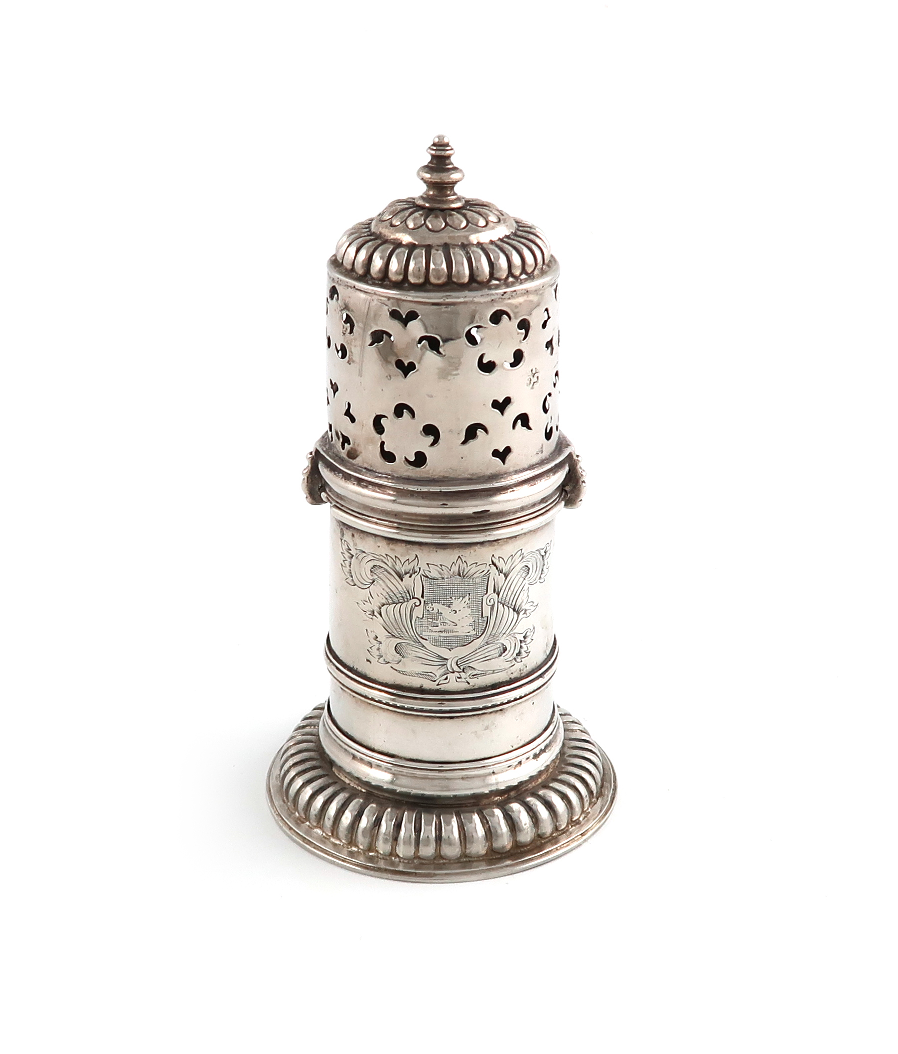 light house form, bayonet fitting pierced cover with fluted decoration, engraved with an armorial within feather mantling, on a spread circular fluted foot, height 13.7cm, approx. weight 5.2oz.