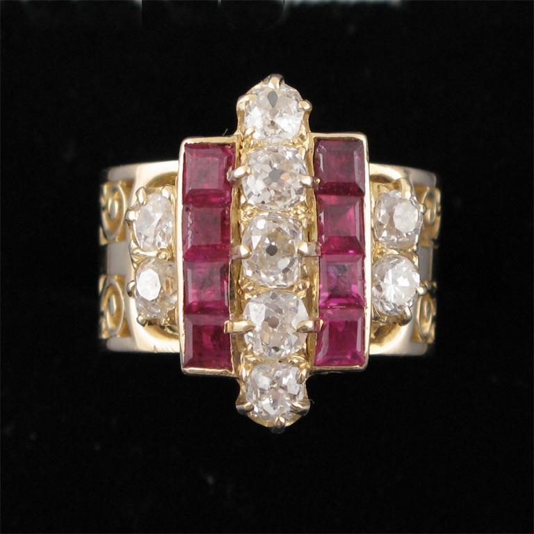 A pierced gold ring set with diamonds and rubies.