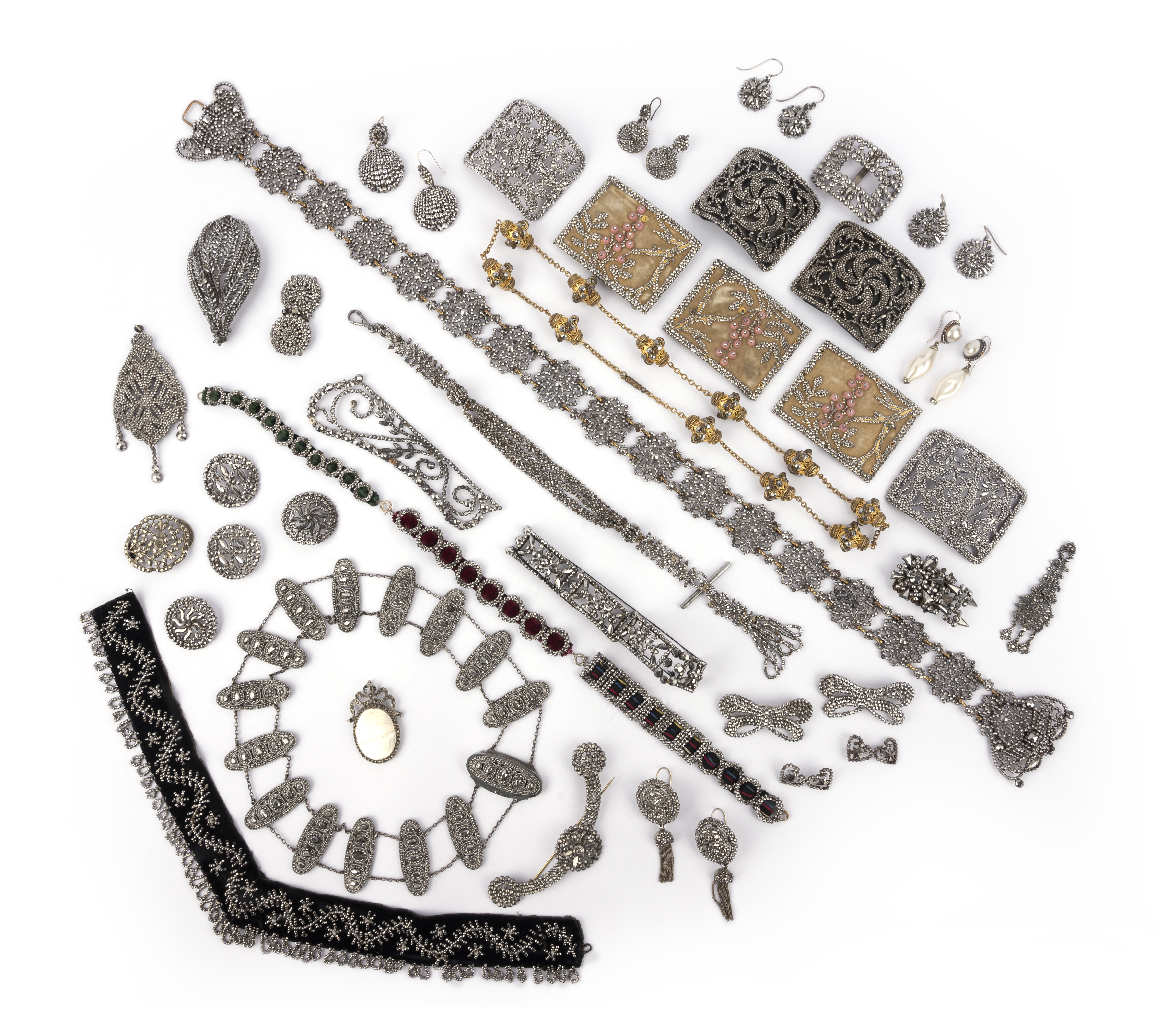 A large collection of cut steel jewels, late 18th/early 19th century, comprising: three necklaces, one composed of oval links connected by two rows of chain, length 47cm, another a choker on a black velvet ribbon; six pairs of earrings, including one set with simulant pearls, longest 6.5cm each, all with hook fittings; a chatelaine; a belt, length 60cm; a bracelet composed of four plaques connected by string; three bracelets on ribbon; five slides; a set of three matching panels accented with pink glass beads and velvet, one with a buckle fitting; four brooches; the side panel of a tiara; two bracelet clasps; the central section of a choker necklace; two pairs of buttons and two heart-shaped motifs