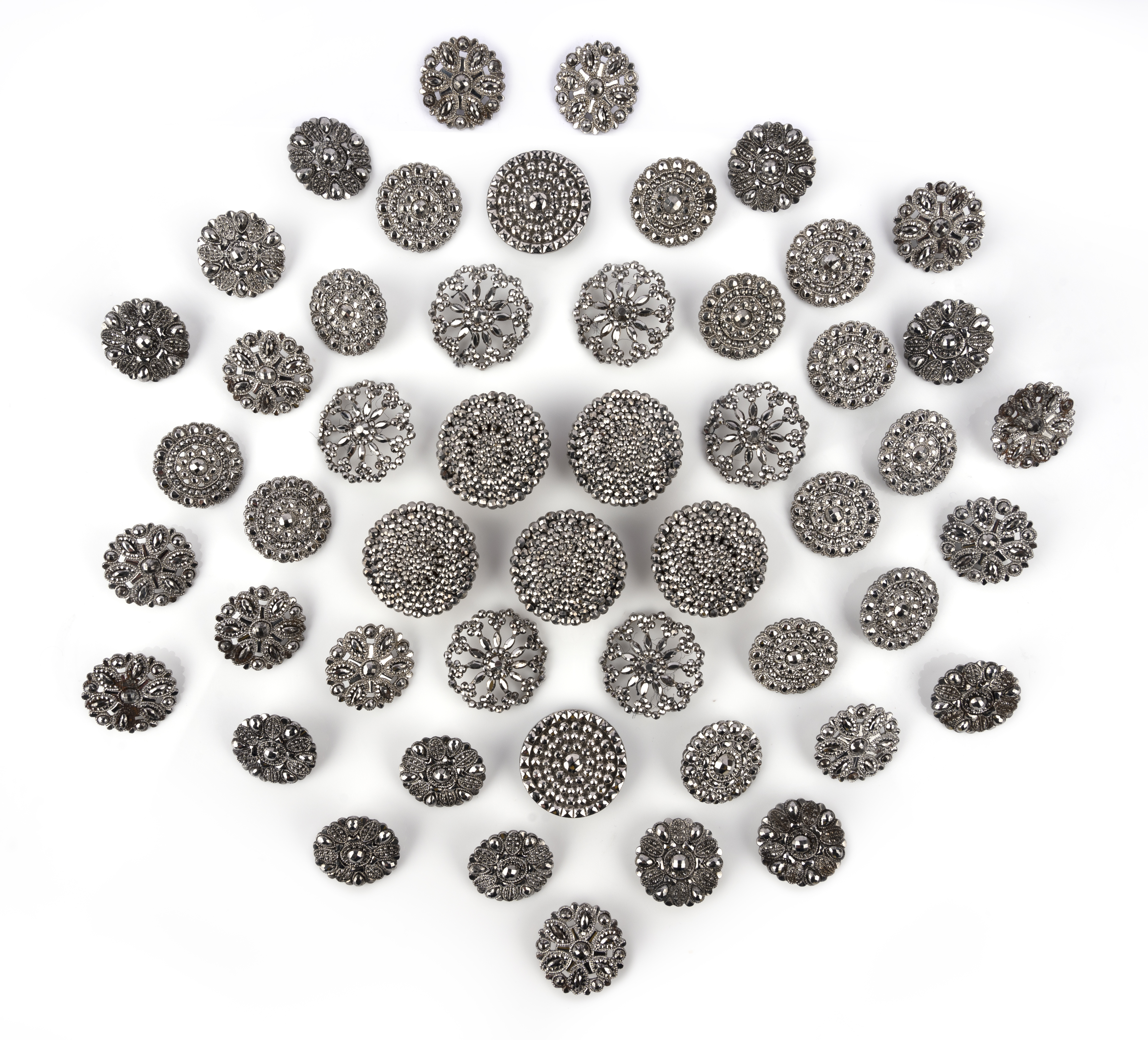 A collection of cut steel buttons, 18th/19th century, comprising: 49 cut steel shirt buttons of various designs, including three matching groups of twelve, largest 3.3cm diameter