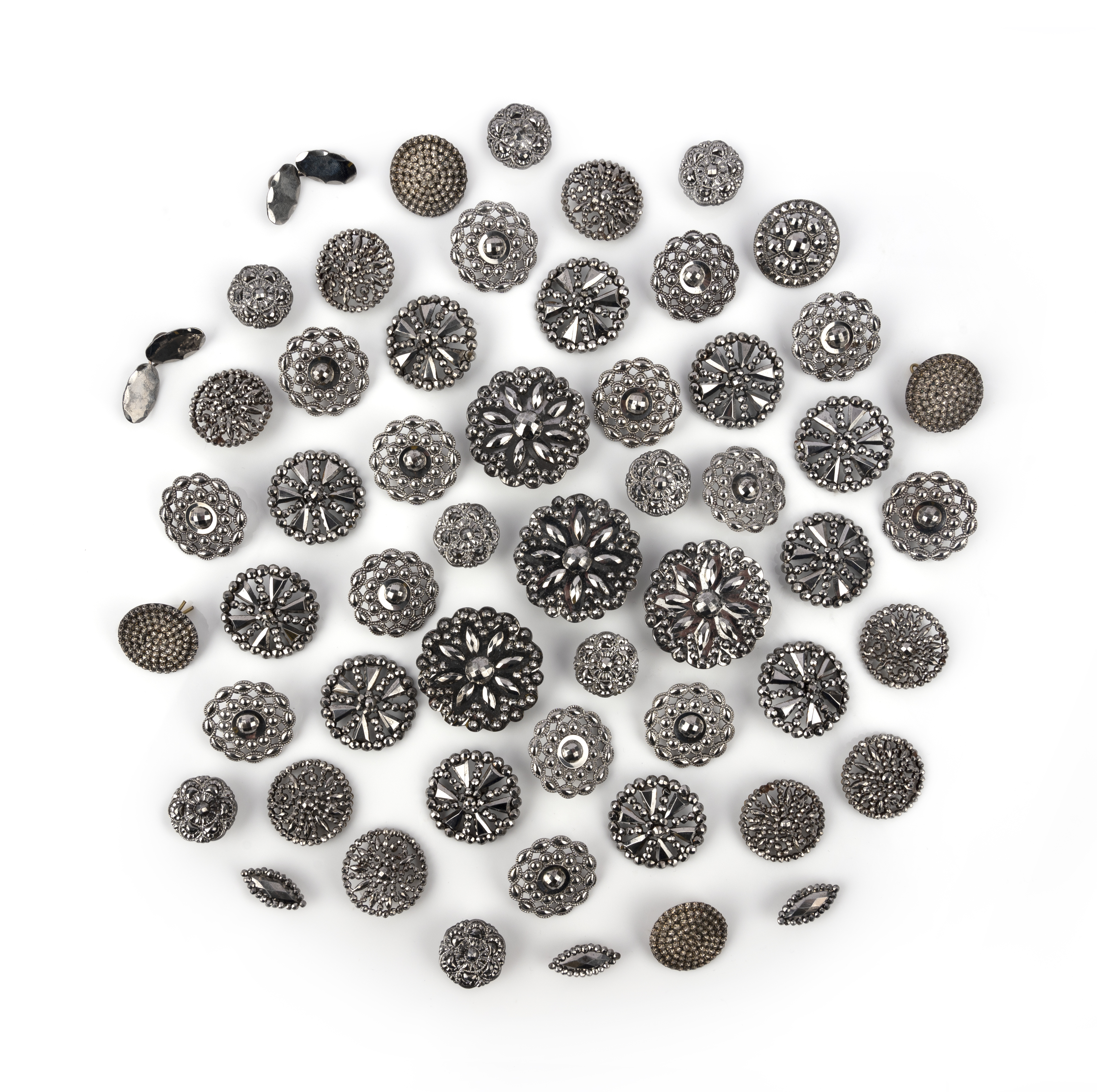 A collection of cut steel buttons and a pair of cufflinks 18th/19th century, comprising: 54 cut steel shirt buttons of various designs, including matching groups of eleven and fourteen, largest 3.7cm diameter; together with a pair of cufflinks