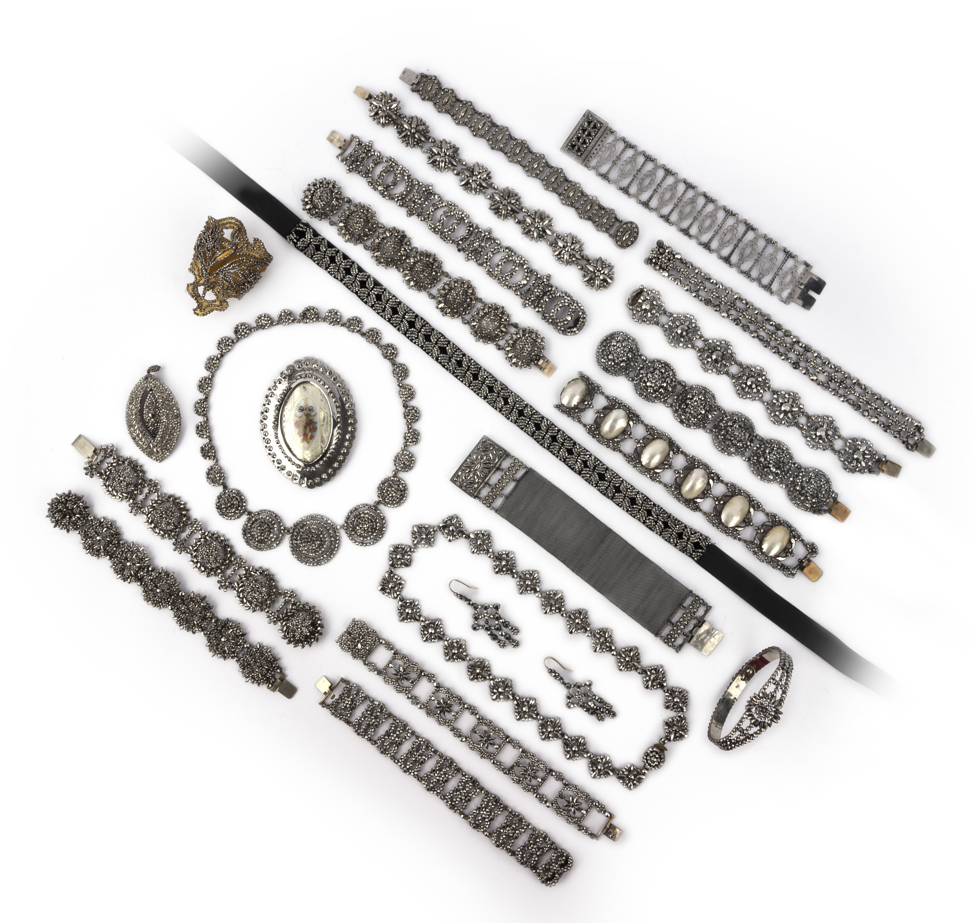 A large collection of cut steel jewellery, late 18th/19th century, comprising: three necklaces, including one ribbon choker; a pair of pendent earrings, hook fittings; a gilt metal clip; a pendant; a navette-shaped plaque enclosing a bouquet of flowers to a pink and green ribbon, fitted case; and fifteen bracelets
