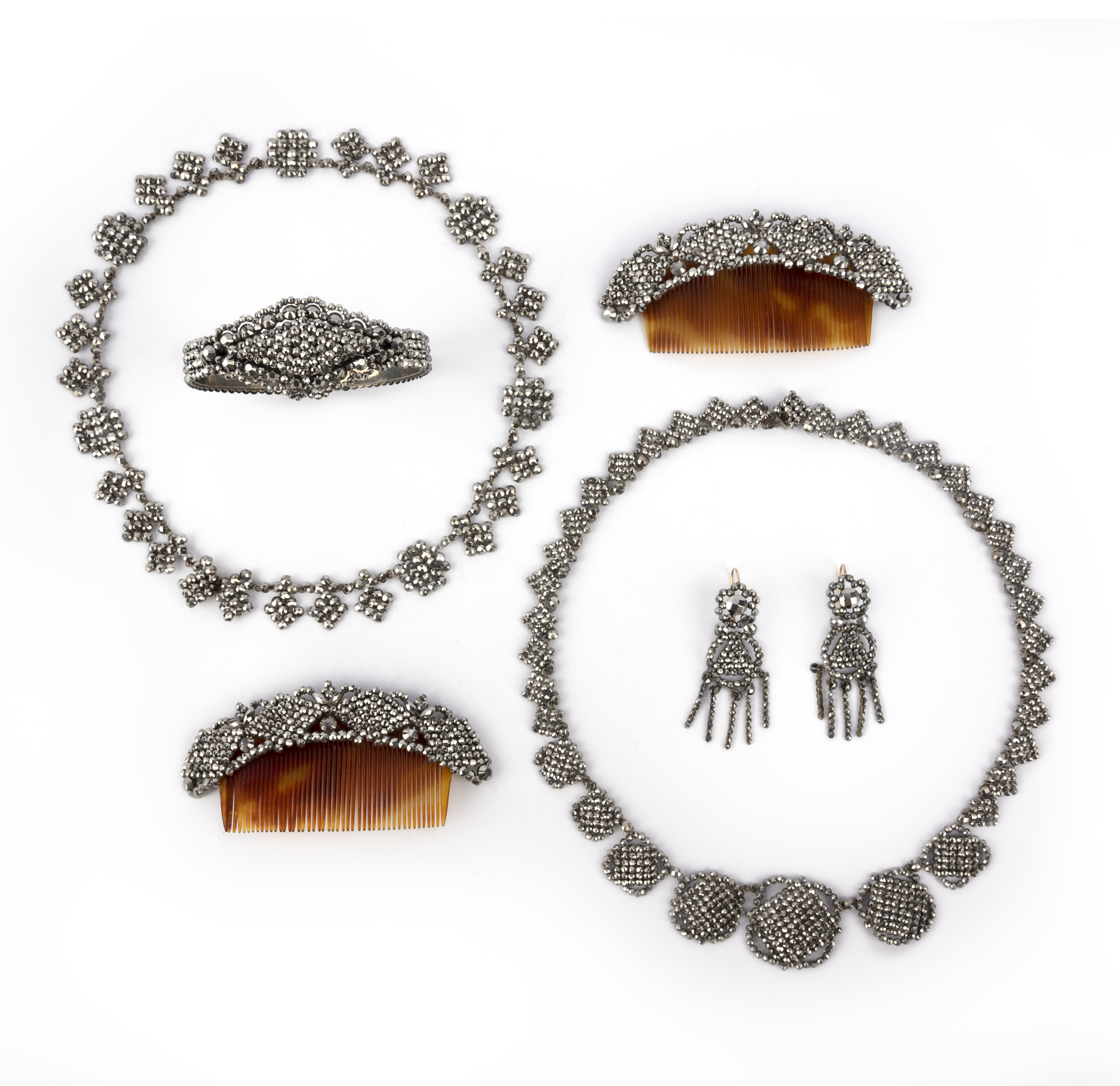 λ A suite of cut steel jewels, 19th century, comprising: a pair of hair ornaments with tortoiseshell fittings, length 9cm each; two necklaces, length of longest 37cm; a bangle, inner circumference 17.3cm; and a pair of earrings suspending a fringe of pendants, length 5.3cm, hook fittings, each of geometric design, set with faceted steel