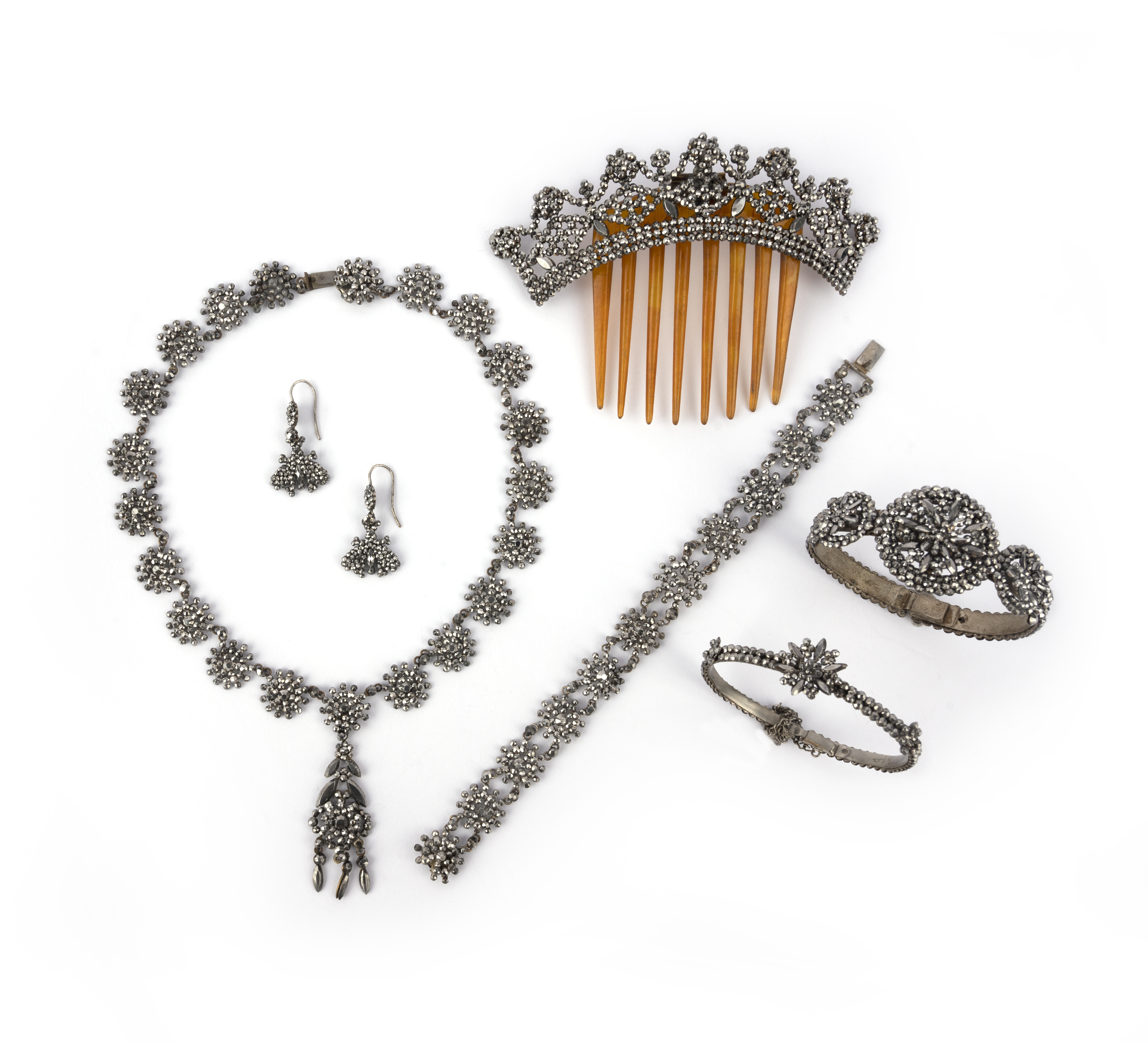 λ A suite of cut steel jewels, 19th century, comprising: a pair of earrings designed as butterflies, length 3.6cm each; a hair ornament with tortoiseshell fittings, inner curve 10cm; a necklace, length 35cm; a matching bracelet, length 19.2cm; and two bangles, larger inner circumference 15.3cm; each composed of floral motifs in faceted steel