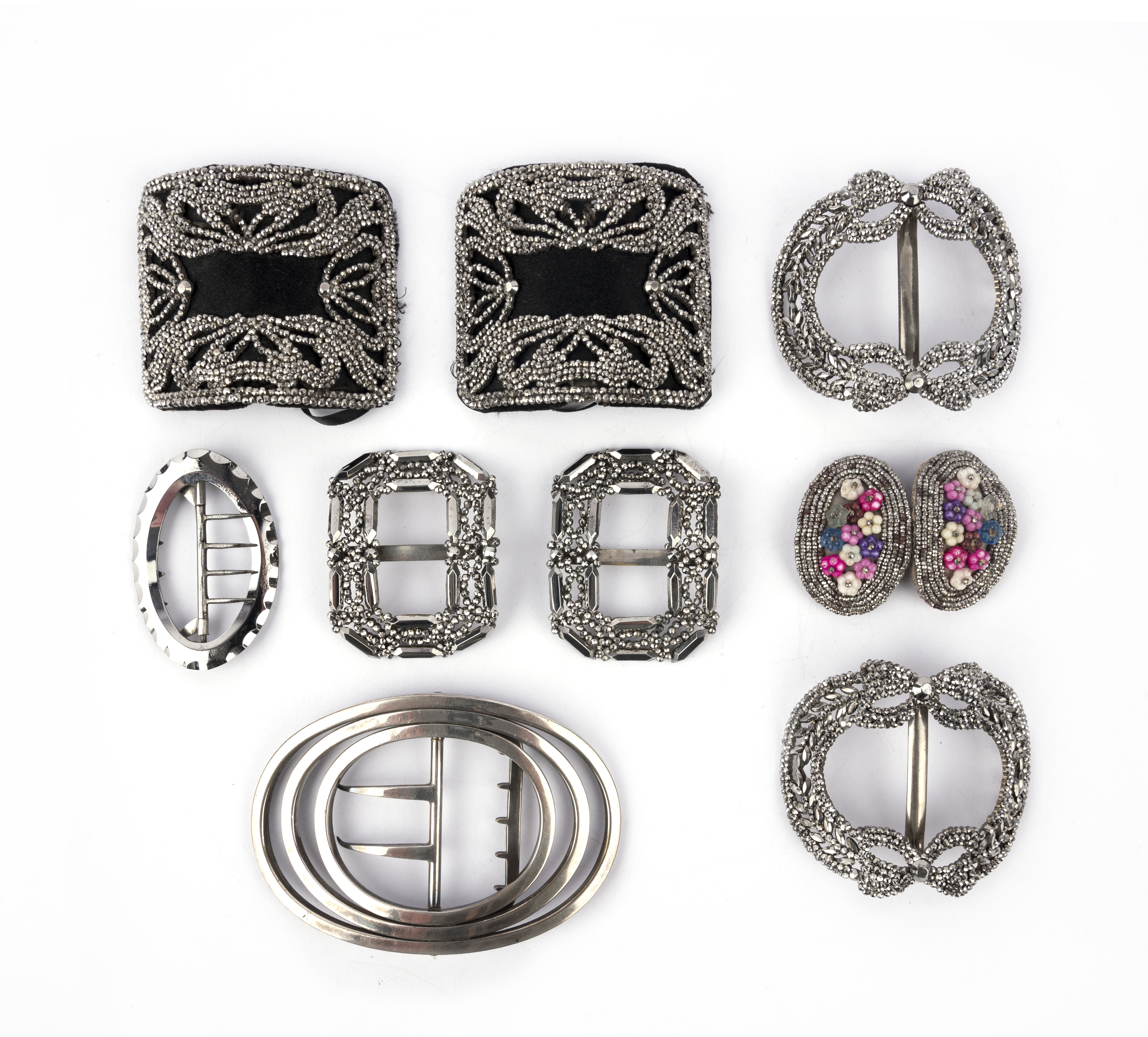 A collection of cut steel shoe buckles, 19th century, comprising: four pairs of buckles and one single buckle in cut steel, one ornamented with floral beads, longest 7.4 x 5.4cm; together with a silver buckle, 9 x 6cm